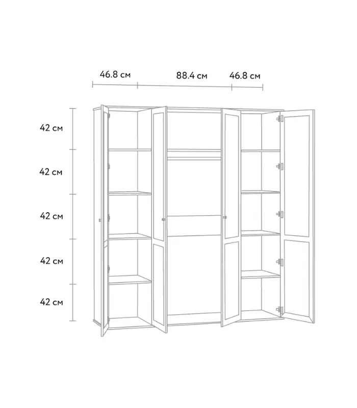 Bên trong, tủ được chia thành 3 khoang chính. Khoang giữa rộng rãi là khu vực treo đồ, với chiều cao thoải mái cho áo khoác, váy dài hay sơ mi. Hai bên gồm nhiều ngăn riêng, phù hợp để xếp quần áo gấp, phụ kiện hoặc đồ dùng cá nhân.