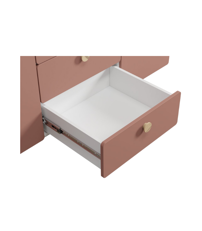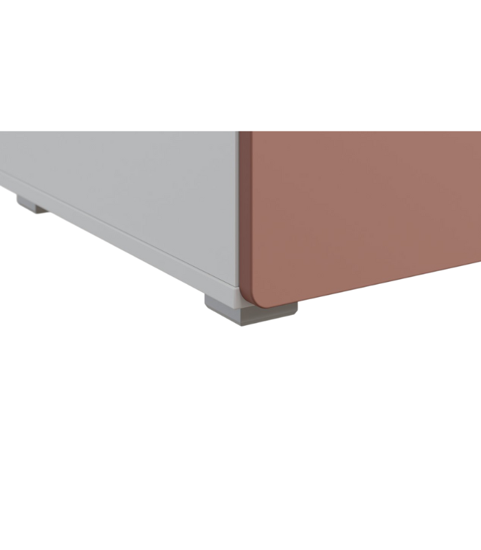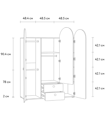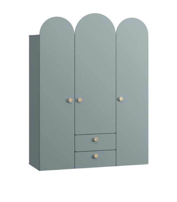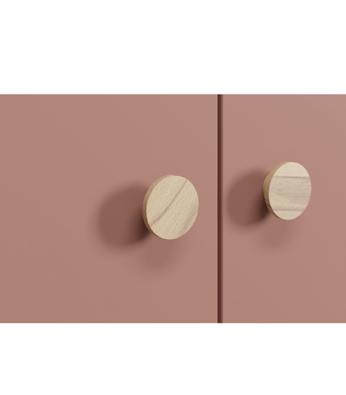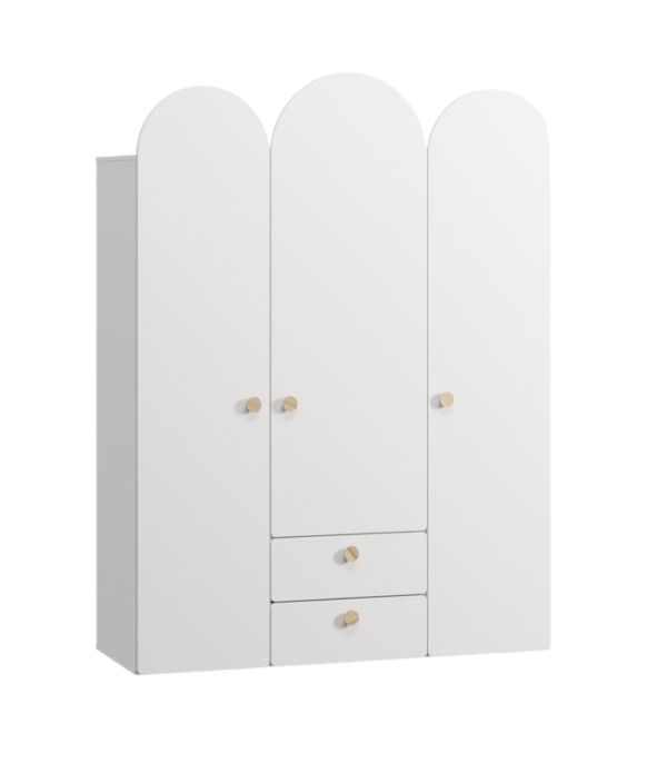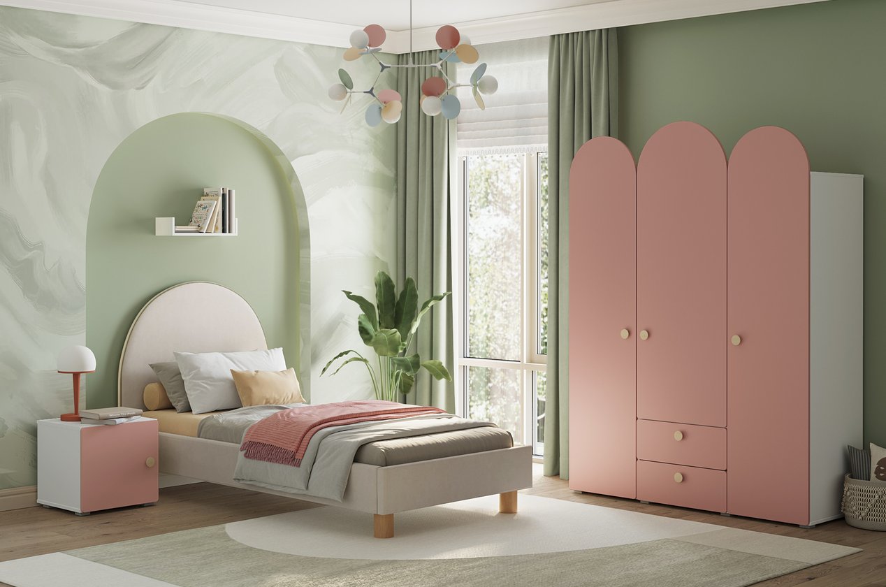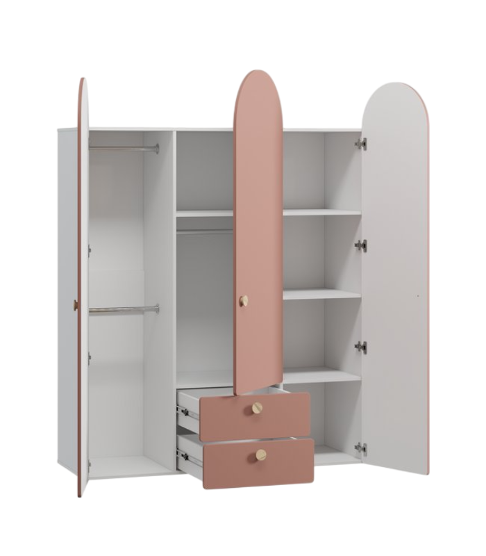 Tủ có kích thước 145 x 52 x 196 cm, được thiết kế cao gọn giúp tối ưu diện tích lưu trữ. Chất liệu MDF phủ melamine chống ẩm đảm bảo độ bền cao, chống trầy xước và dễ dàng vệ sinh. Cánh tủ sơn PU một mặt mang lại bề mặt mịn màng, đều màu và bóng nhẹ, tăng tính thẩm mỹ cho sản phẩm. Màu hồng Charlie dịu dàng, ấm áp, tạo cảm giác gần gũi và sang trọng cho không gian. Thiết kế ba cánh tủ cong mềm mại ở phía trên mang lại nét độc đáo và thanh thoát. Tay nắm gỗ tròn tự nhiên là điểm nhấn tinh tế, giúp tủ thêm hài hòa và thân thiện. Tủ gồm ba khoang lớn để treo quần áo, cất đồ gấp và hai ngăn kéo nhỏ bên dưới tiện dụng cho việc lưu trữ phụ kiện. Các cạnh được bo tròn an toàn, phù hợp cho gia đình có trẻ nhỏ.