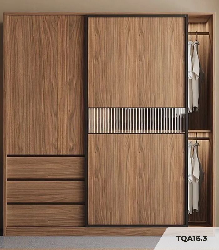 Tủ quần áo Cánh Lùa Gỗ kết hợp Khung nhôm Kính sọc trong 160×240 TQA16.3 – Wanut Đậm