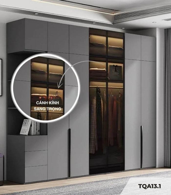 Tủ quần áo Cánh Mở Gỗ kết hợp Khung nhôm Kính màu 280×240 TQA13.1 – Graphite là minh chứng cho sự giao thoa hài hòa giữa nghệ thuật sắp đặt và công năng lưu trữ hiện đại. Với thiết kế mở rộng tinh tế, sản phẩm không chỉ là một hệ tủ thông thường mà còn đóng vai trò như một mảng tường kiến trúc thanh lịch, mang lại chiều sâu và phong cách tinh tế cho phòng ngủ. Đây là lựa chọn phù hợp cho những gia chủ sở hữu bộ sưu tập thời trang đa dạng, muốn biến không gian riêng tư thành một nơi cất giữ gọn gàng và mang đậm dấu ấn cá nhân.