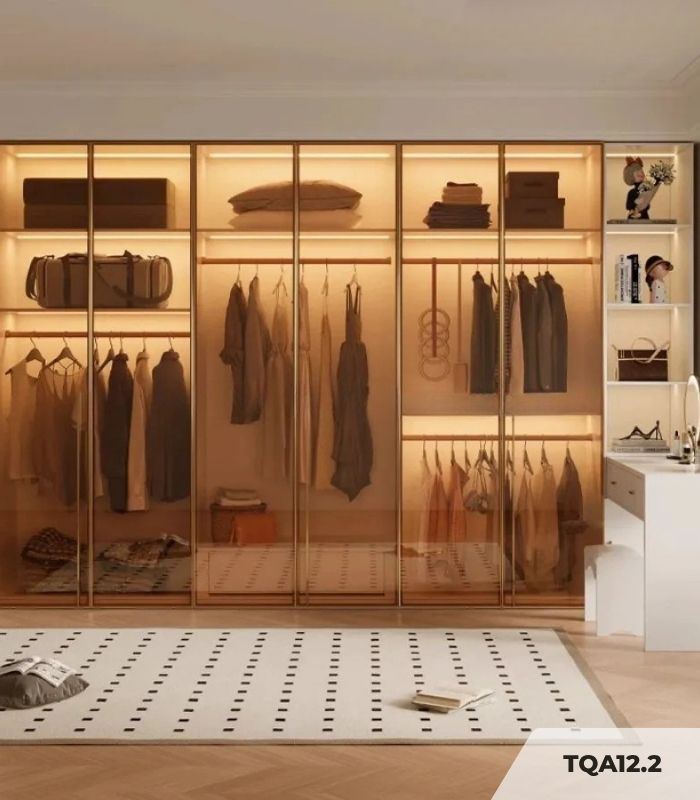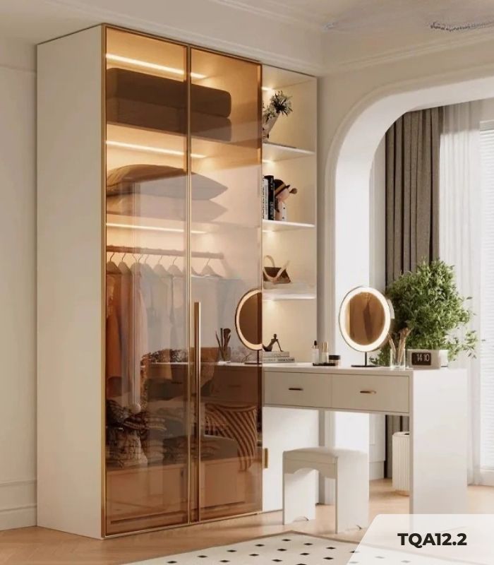 Về phương diện công năng, hệ tủ tối ưu hóa trải nghiệm người dùng thông qua các phân khu nội thất thông minh. Khu vực tủ quần áo với các buồng treo và ngăn kệ đáp ứng trọn vẹn nhu cầu sắp xếp trang phục, trong khi bàn trang điểm liền khối với gương soi tạo nên một góc làm đẹp riêng tư, giúp việc chuẩn bị diện mạo hằng ngày trở nên thuận tiện. Để bảo quản và duy trì độ bền đẹp của sản phẩm, người dùng nên lau chùi bề mặt định kỳ bằng khăn mềm ẩm, tuyệt đối tránh sử dụng các loại hóa chất tẩy rửa mạnh. Đồng thời, cần thao tác đóng mở nhẹ nhàng, hạn chế va đập vật cứng trực tiếp lên mặt kính và thường xuyên vệ sinh hệ thống bản lề, ray trượt để tủ luôn vận hành trơn tru và êm ái.