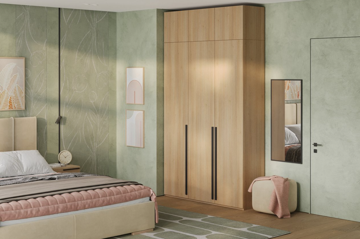 Thiết kế 3 cánh thông minh, tối ưu hóa không gian lưu trữ. Cánh bên trái gồm các kệ mở tiện lợi để gấp quần áo, phụ kiện hoặc đồ dùng cá nhân. Hai cánh còn lại là khu vực treo rộng rãi, phù hợp với mọi loại trang phục từ áo sơ mi, váy đến áo khoác dài. Bên trong còn có tủ kệ nhỏ, giúp phân loại đồ đạc gọn gàng, dễ tìm.