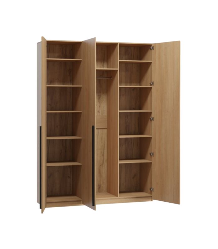 Với kích thước 150x50x210cm, tủ dễ bố trí ở nhiều không gian phòng ngủ, kể cả những phòng có diện tích vừa phải. Thiết kế 3 cánh mở gồm 1 khoang treo đồ trung tâm và 2 khoang kệ hai bên, giúp phân chia hợp lý giữa quần áo treo, gấp và phụ kiện. Cánh giả mây thanh thoát làm điểm nhấn tinh tế, tạo cảm giác thoáng đãng và mềm mại cho tổng thể tủ.