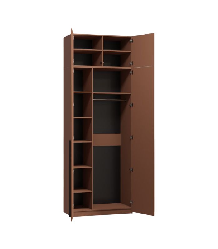 Thiết kế 2 cánh mở tiện dụng, mang lại sự cân đối và hài hòa cho tổng thể không gian. Phần ngăn trên cao có 2 kệ nhỏ, thích hợp để lưu trữ chăn mỏng, vali nhỏ hoặc phụ kiện mùa vụ. Ngăn dưới gồm nhiều tầng kệ giúp gấp gọn quần áo, túi xách, và khu vực treo đồ dành cho quần áo dài như váy, áo khoác.