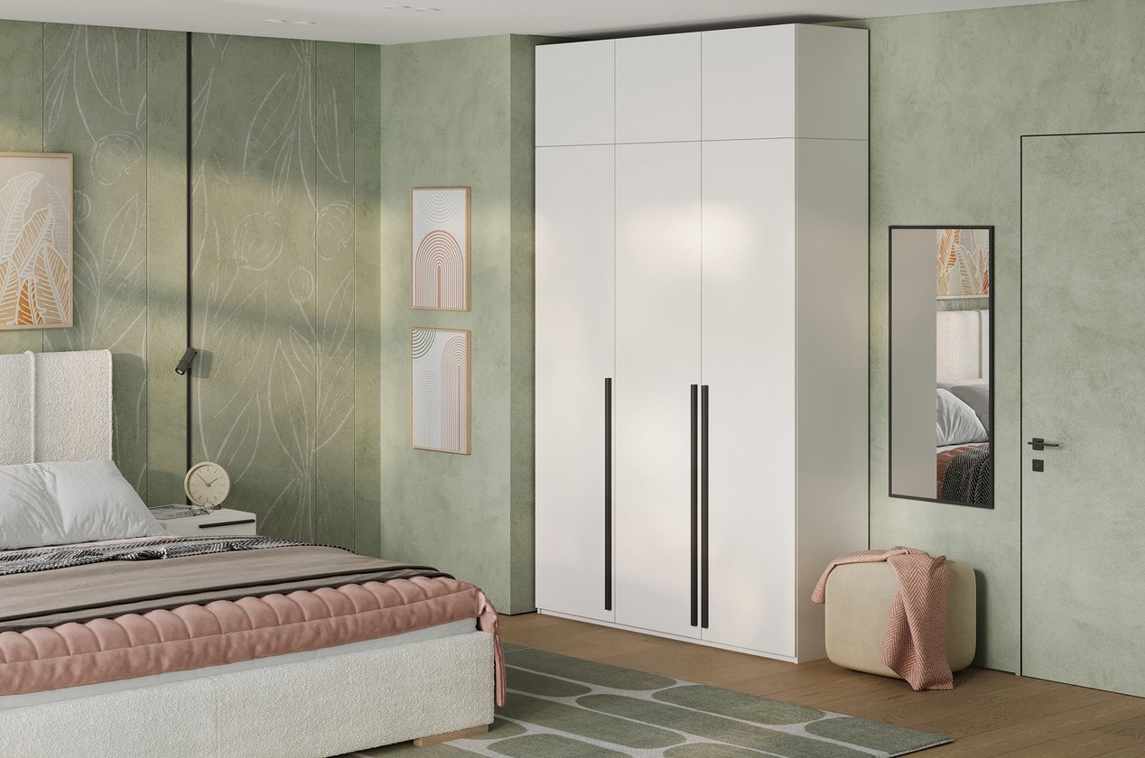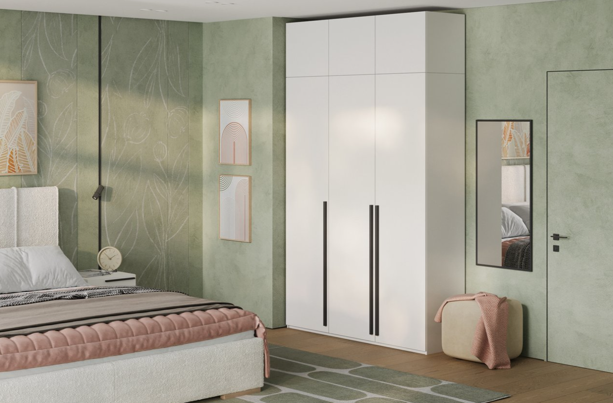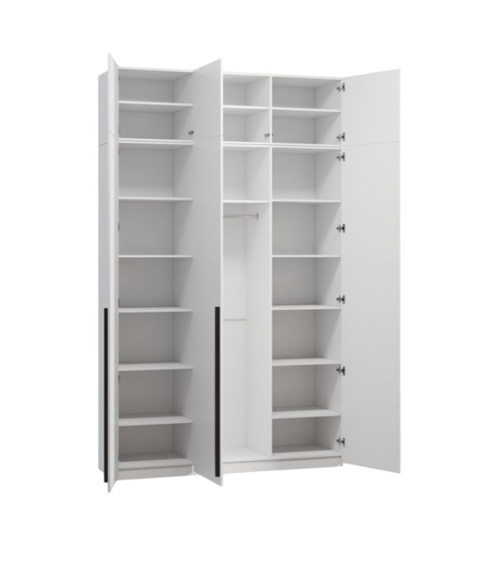 Thiết kế 3 cánh thông minh tối ưu hóa không gian lưu trữ. Cánh bên trái gồm các kệ mở tiện dụng để gấp quần áo, phụ kiện hoặc đồ dùng cá nhân. Hai cánh còn lại là khu vực treo quần áo rộng rãi, phù hợp với áo sơ mi, váy, áo khoác dài. Tủ kệ nhỏ bên trong giúp phân loại đồ đạc ngăn nắp, thuận tiện tìm kiếm.