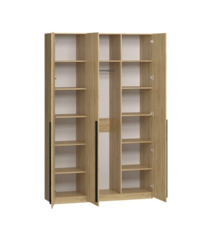Thiết kế 3 cánh mở tiện dụng: cánh giữa dùng để treo quần áo, hai cánh hai bên chia thành nhiều ngăn kệ nhỏ, lý tưởng để cất đồ gấp, túi xách hoặc vật dụng cá nhân. Phần cánh giả mây độc đáo vừa tạo sự thoáng nhẹ vừa tăng thêm tính thẩm mỹ, khiến tổng thể hài hòa và ấm cúng hơn.