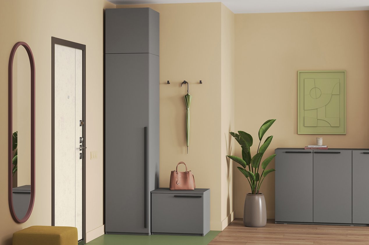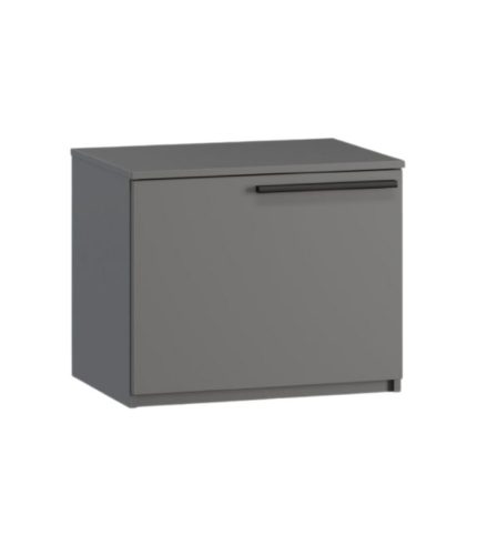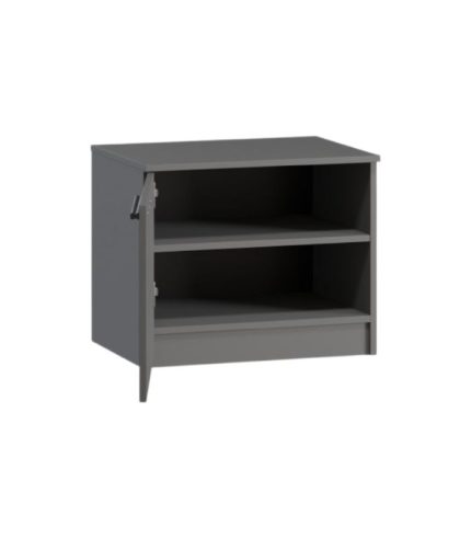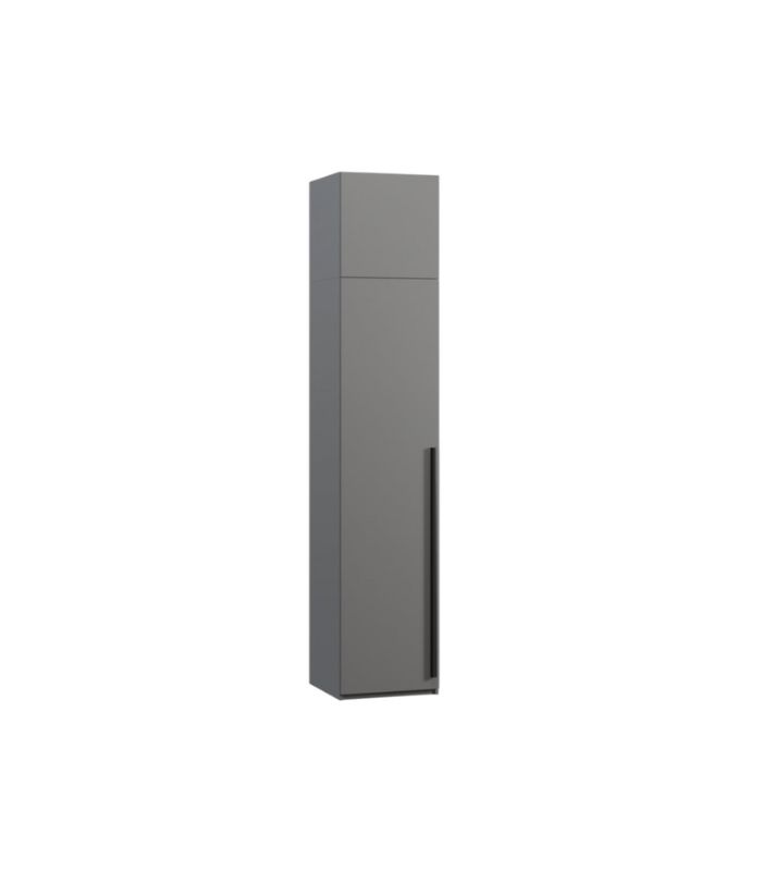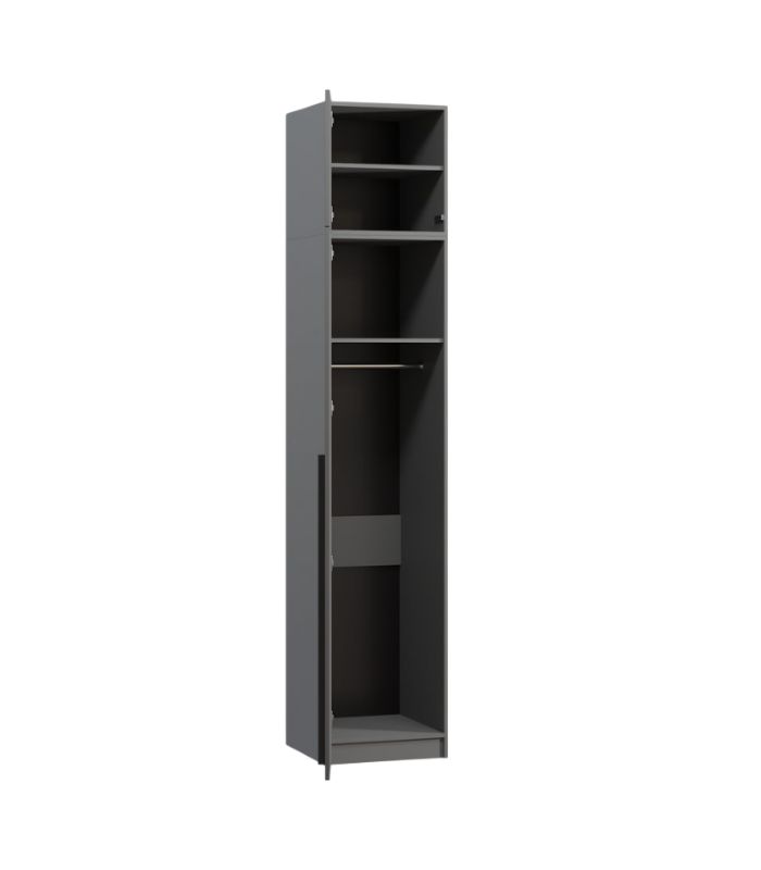 Phần trên cao được chia thành hai ngăn kệ nhỏ, lý tưởng để cất chăn, gối hoặc các vật dụng ít dùng. Phần dưới tủ gồm một khu vực có kệ xếp gọn cho quần áo gấp và ngăn treo quần áo rộng rãi, giúp sắp xếp đồ ngăn nắp, dễ quan sát. Gam xám chì thanh lịch tạo cảm giác sang trọng, hiện đại, dễ phối hợp với nhiều tone màu nội thất khác nhau. Thiết kế tủ chú trọng tối ưu công năng trong diện tích nhỏ, phù hợp với căn hộ, nhà phố hay không gian phòng ngủ đơn.