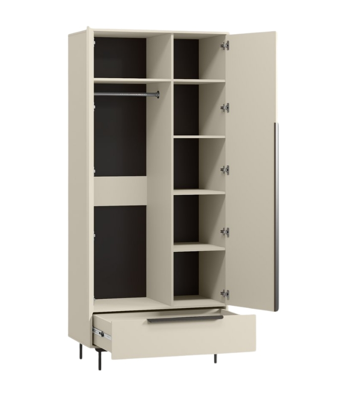 Bên trong tủ được phân chia hợp lý với nhiều khoang chức năng: khu vực treo quần áo dài, các đợt để đồ gấp và một ngăn kéo rộng phía dưới. Nhờ vậy, việc lưu trữ trở nên trật tự và dễ dàng hơn. Cánh mở mượt mà, hạn chế tiếng ồn, thích hợp cho không gian thư giãn.