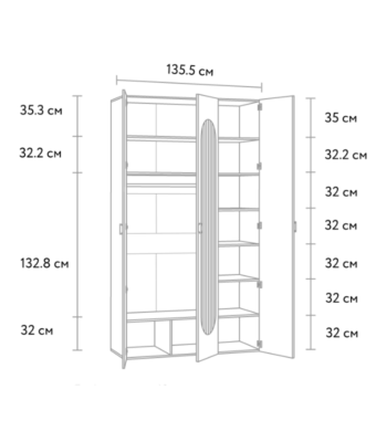 Kích thước Rộng 136cm x Sâu 52cm x Cao 242cm, Tủ được thiết kế 3 cánh gọn gàng, tiết kiệm diện tích nhưng vẫn đáp ứng đủ nhu cầu lưu trữ quần áo và phụ kiện cá nhân