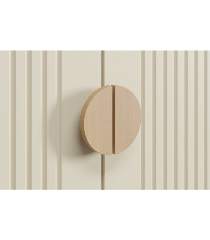 Ngoại hình tủ nổi bật với các chi tiết bo cong nhẹ nhàng, đường rãnh dọc mềm mại và tay nắm gỗ tròn tự nhiên, mang lại cảm giác ấm áp và gần gũi. Gam màu trắng kem thanh lịch giúp không gian phòng ngủ trở nên sáng sủa, hài hòa và dễ phối hợp với nhiều món nội thất khác.