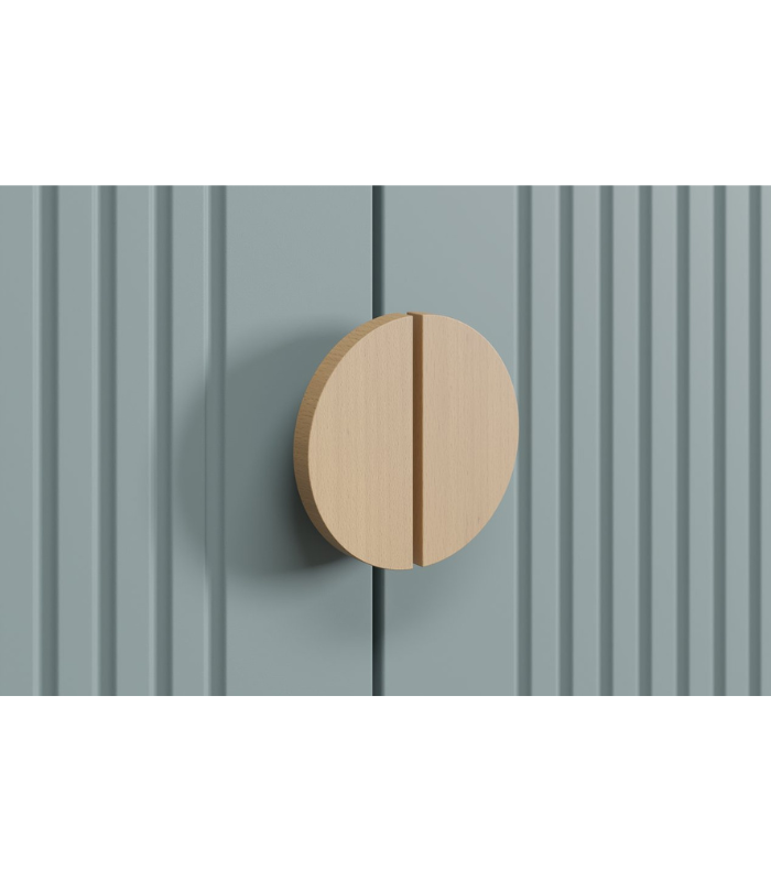 Đường rãnh dọc thanh thoát kết hợp bo cong tinh tế làm nổi bật vẻ hiện đại của tủ. Tay nắm gỗ tròn sáng màu mang lại điểm nhấn tự nhiên và hài hòa.