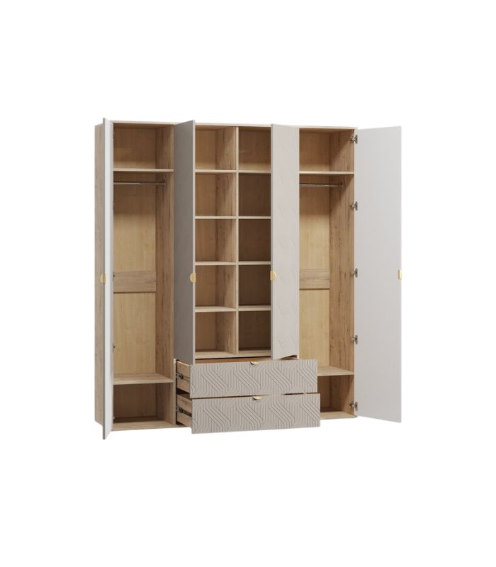 2 cánh giữa phần dưới gộp thêm 2 ngăn kéo rộng rãi, lý tưởng lưu trữ phụ kiện, đồ gấp hoặc vật dụng cá nhân. Bên trong cánh trái và phải ngoài cùng là khu vực treo quần áo kết hợp 2 ngăn kệ trên và dưới, phù hợp áo khoác, váy, áo sơ mi và quần dài. 2 cánh giữa bố trí các kệ đựng đồ, thuận tiện cho quần áo gấp, túi xách hoặc vật dụng cá nhân khác.