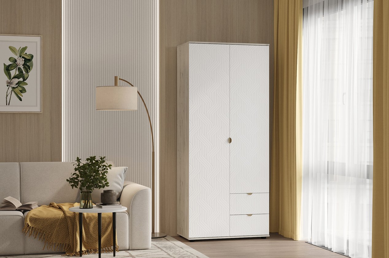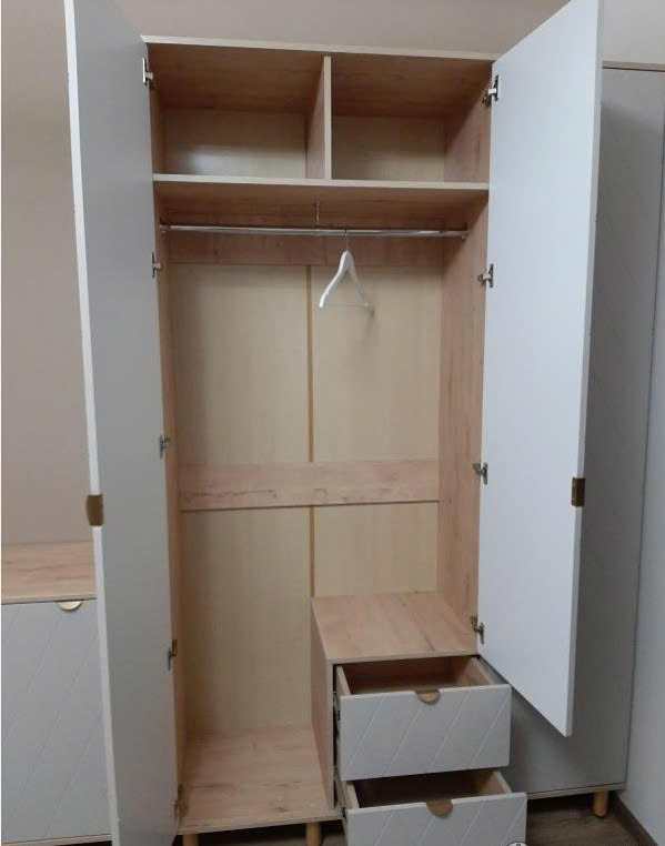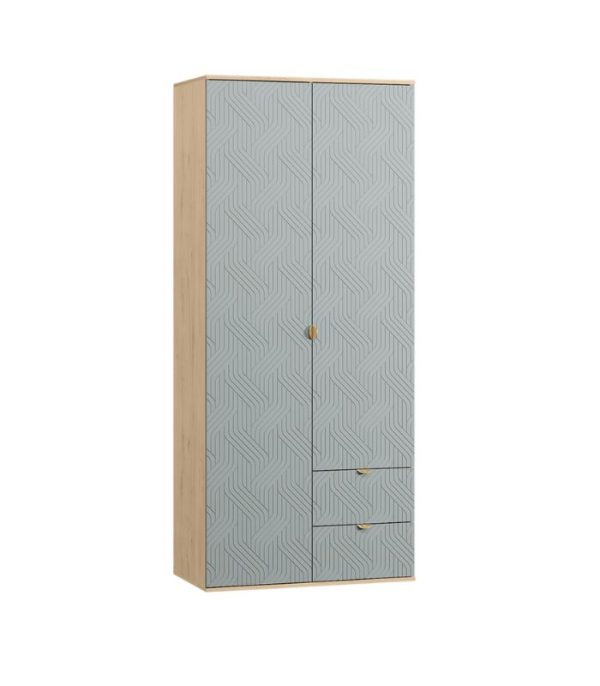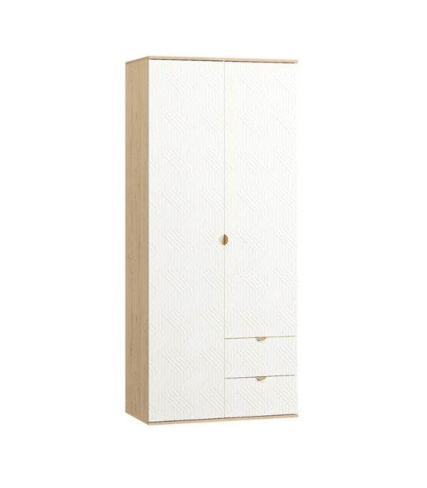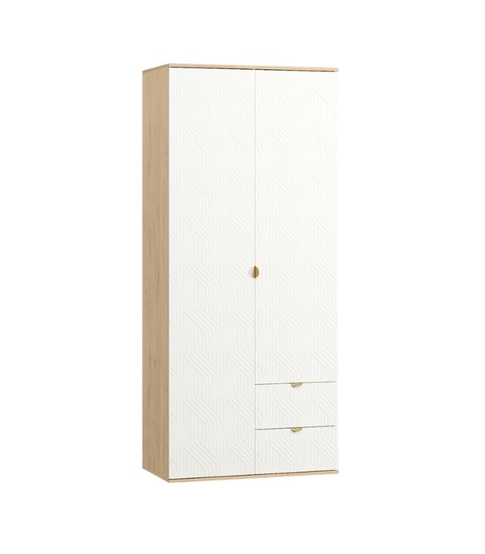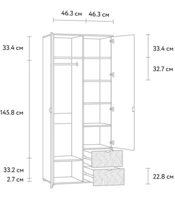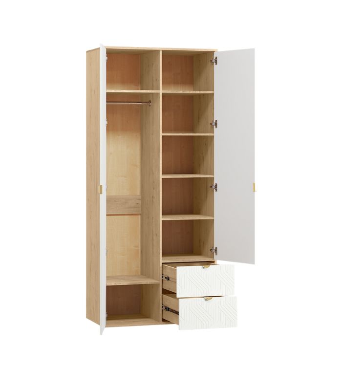 Kích thước 93x50x215 cm tối ưu, lưu trữ nhiều đồ nhưng vẫn gọn gàng và tiện nghi. Tủ thiết kế 2 cánh, giúp sắp xếp quần áo dễ dàng, tiết kiệm diện tích. Cánh bên phải có 2 ngăn kéo rộng rãi, lý tưởng để lưu trữ phụ kiện, đồ gấp hoặc vật dụng cá nhân. Bên trái bố trí khu vực treo quần áo kết hợp kệ nhỏ, phù hợp với áo sơ mi, váy, áo khoác và quần dài. Bên phải có các kệ đựng đồ, thuận tiện cho túi xách, quần áo gấp hoặc các vật dụng khác.