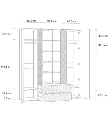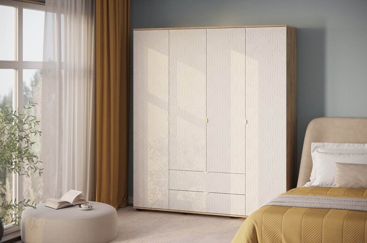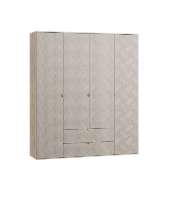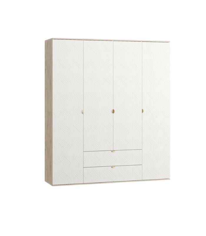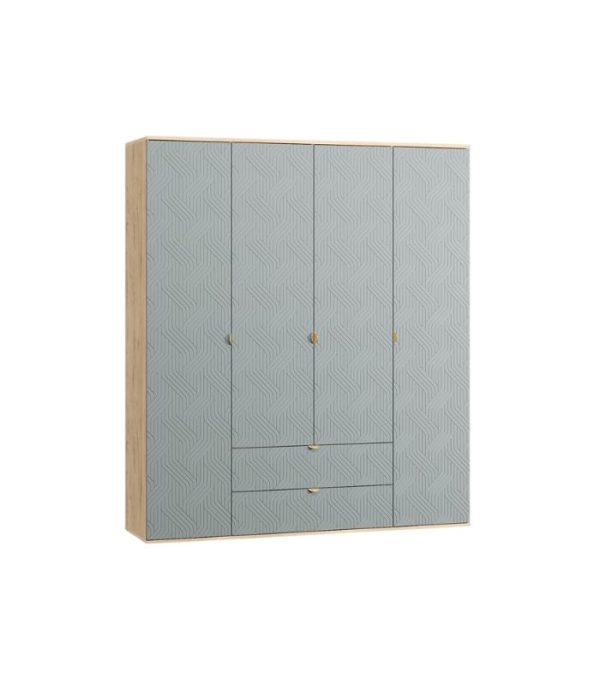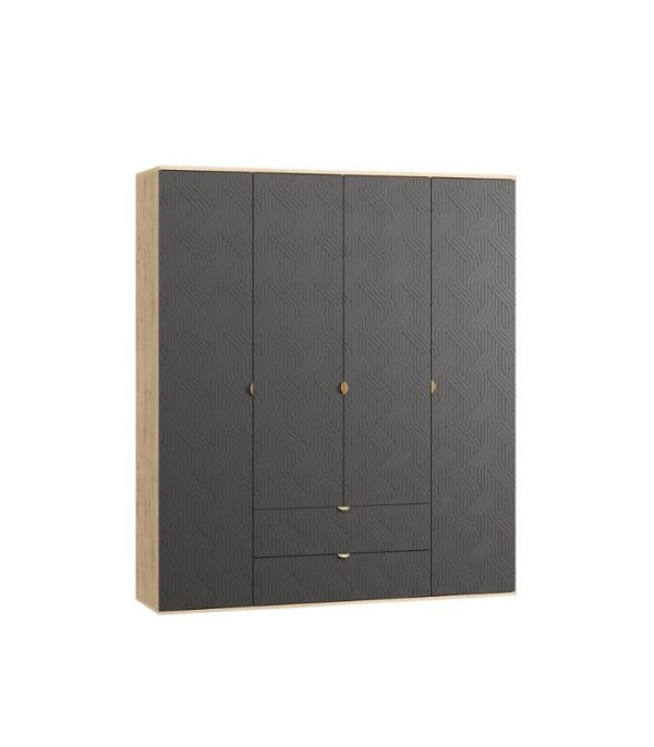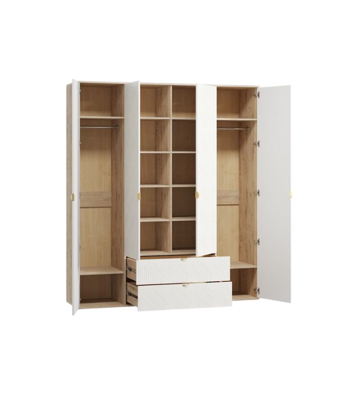 Kích thước 185x50x215 cm tối ưu cho phòng rộng, cung cấp không gian lưu trữ thoải mái cho gia đình. Thiết kế gồm 4 cánh tiện dụng, giúp sắp xếp và lấy quần áo nhanh chóng, tiết kiệm thời gian. 2 cánh giữa phần dưới gộp thêm 2 ngăn kéo rộng rãi, lý tưởng lưu trữ phụ kiện, đồ gấp hoặc vật dụng cá nhân. Bên trong cánh trái và phải ngoài cùng là khu vực treo quần áo kết hợp 2 ngăn kệ trên và dưới, phù hợp với áo khoác, váy, áo sơ mi và quần dài. 2 cánh giữa bố trí các kệ đựng đồ, thuận tiện để quần áo gấp, túi xách hoặc vật dụng cá nhân khác.