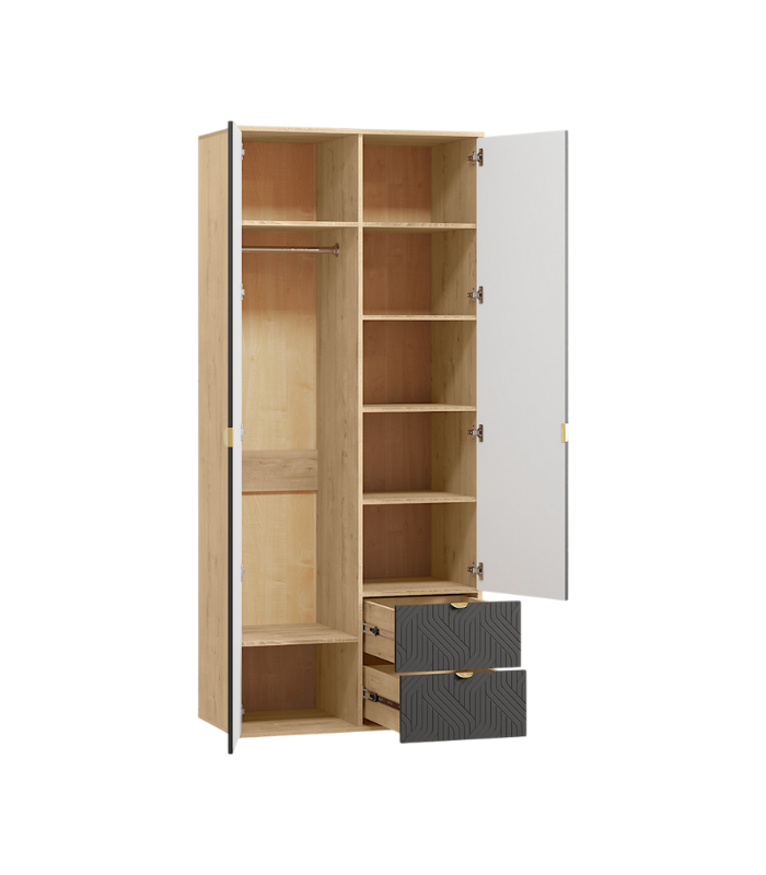 Kích thước 93x50x215 cm tối ưu, phù hợp với nhiều không gian phòng ngủ, vừa chứa được nhiều đồ mà vẫn gọn gàng. Tủ thiết kế gồm 2 cánh tiện dụng, thuận tiện khi lấy đồ và sắp xếp quần áo. Cánh bên phải có 2 ngăn kéo rộng rãi ở dưới, giúp lưu trữ các vật dụng nhỏ gọn một cách ngăn nắp. Bên trong cánh trái là khu vực treo quần áo và kệ nhỏ, phù hợp cho áo sơ mi, váy, áo khoác hoặc quần dài. Bên phải được bố trí các kệ đựng đồ, lý tưởng để sắp xếp đồ gấp, túi xách hoặc các phụ kiện cá nhân.