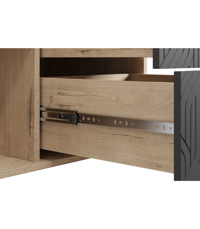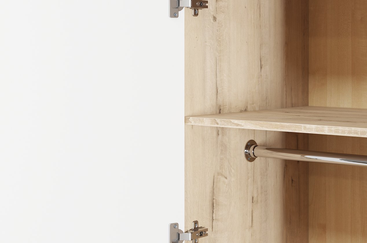 Kích thước 93x50x215 cm tối ưu, phù hợp với nhiều không gian phòng ngủ, vừa chứa được nhiều đồ mà vẫn gọn gàng. Tủ thiết kế gồm 2 cánh tiện dụng, thuận tiện khi lấy đồ và sắp xếp quần áo. Cánh bên phải có 2 ngăn kéo rộng rãi ở dưới, giúp lưu trữ các vật dụng nhỏ gọn một cách ngăn nắp. Bên trong cánh trái là khu vực treo quần áo và kệ nhỏ, phù hợp cho áo sơ mi, váy, áo khoác hoặc quần dài. Bên phải được bố trí các kệ đựng đồ, lý tưởng để sắp xếp đồ gấp, túi xách hoặc các phụ kiện cá nhân.