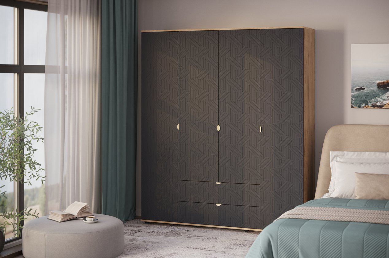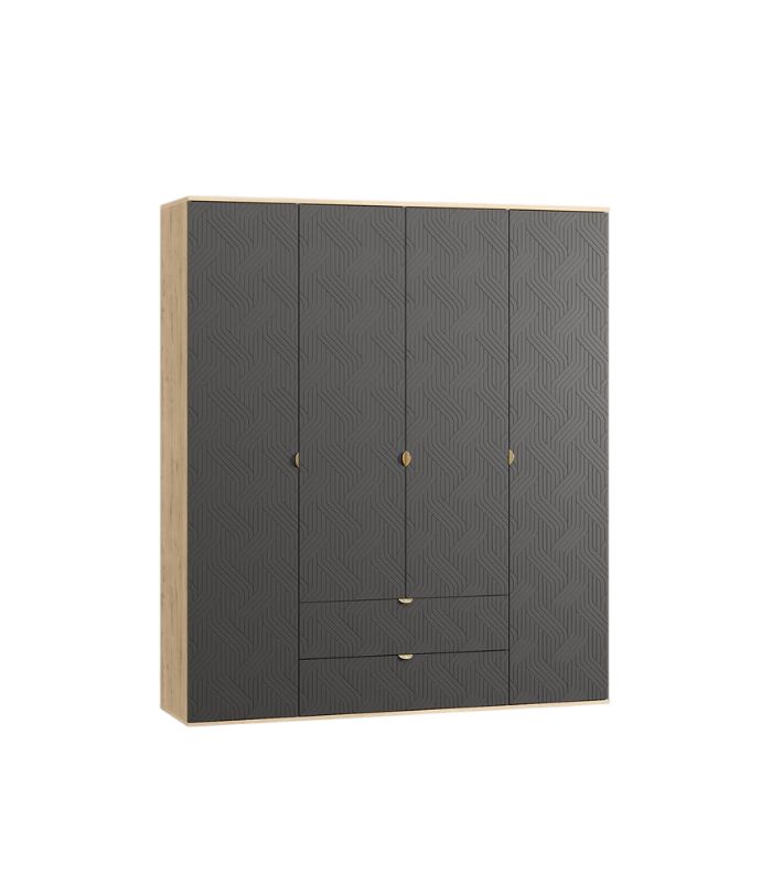 Kích thước 185x50x215 cm, cung cấp không gian lưu trữ rộng rãi, phù hợp với phòng ngủ lớn hoặc phòng master. Thiết kế gồm 4 cánh tiện dụng, giúp sắp xếp và lấy quần áo dễ dàng, tiết kiệm thời gian. 2 cánh giữa có phần dưới gộp thêm 2 ngăn kéo rộng rãi, lý tưởng để lưu trữ phụ kiện, đồ gấp hoặc vật dụng cá nhân. Bên trong cánh trái và phải ngoài cùng bố trí khu vực treo quần áo, kết hợp 2 ngăn kệ trên và dưới, phù hợp với áo khoác, váy, quần dài và áo sơ mi. 2 cánh giữa là các kệ đựng đồ, thuận tiện để xếp quần áo gấp, túi xách hoặc các vật dụng cá nhân khác.