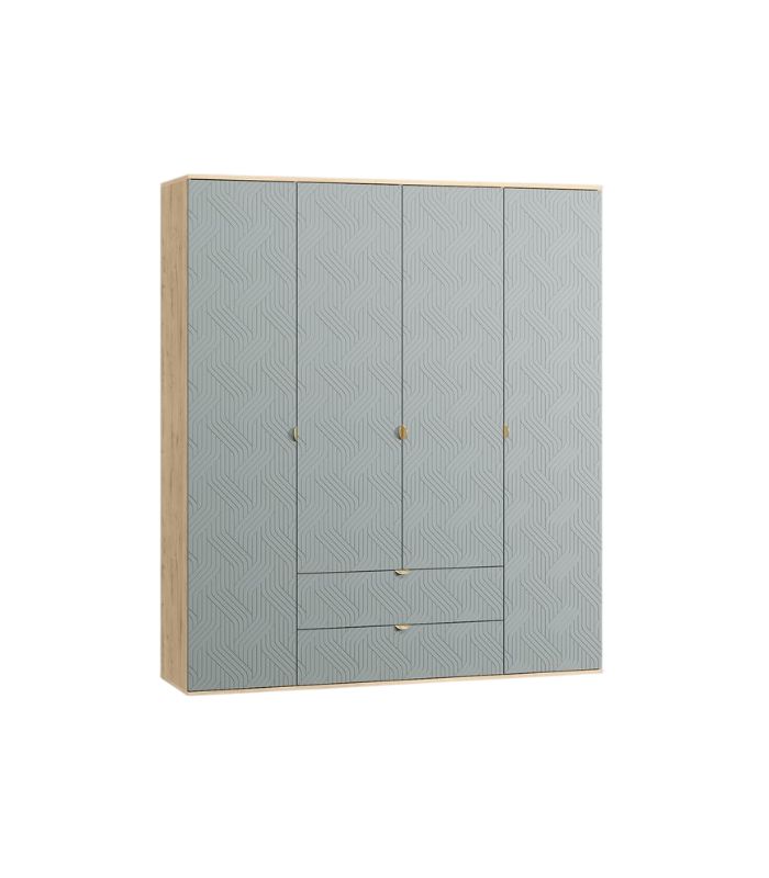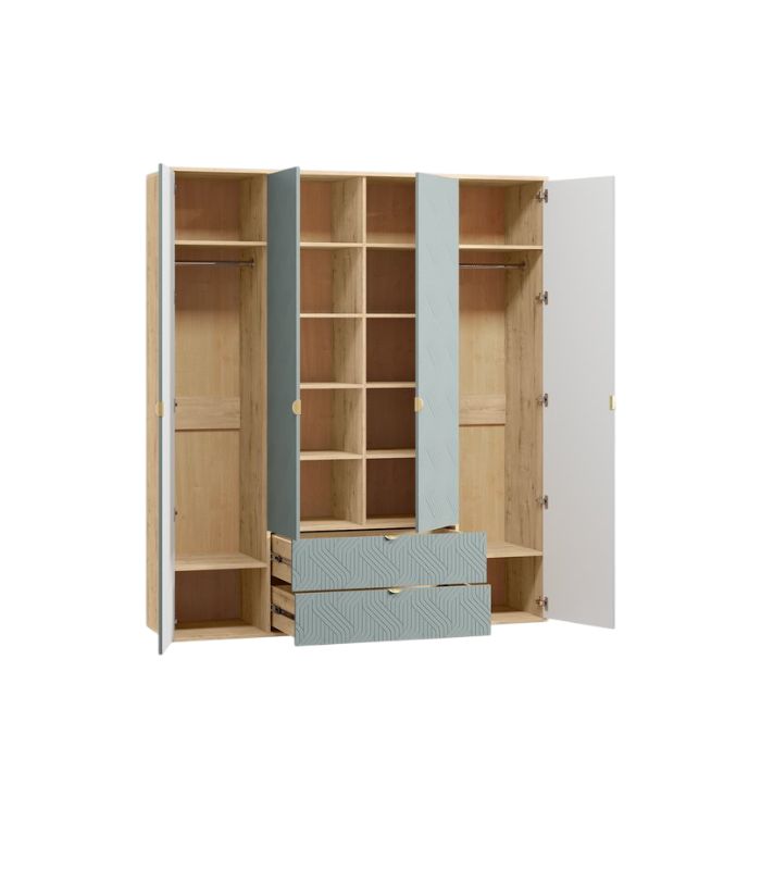 Kích thước 185x50x215 cm tối ưu cho phòng rộng, cung cấp không gian lưu trữ thoải mái. Thiết kế gồm 4 cánh tiện lợi, dễ dàng sắp xếp và lấy quần áo nhanh chóng. 2 cánh giữa phần dưới gộp thêm 2 ngăn kéo rộng rãi, thuận tiện lưu trữ phụ kiện hoặc đồ gấp. Bên trong cánh trái và phải ngoài cùng là khu vực treo quần áo, kết hợp 2 ngăn kệ trên và dưới, phù hợp với áo khoác, váy, áo sơ mi và quần dài. 2 cánh giữa bố trí các kệ đựng đồ, lý tưởng để quần áo gấp, túi xách hoặc vật dụng cá nhân.