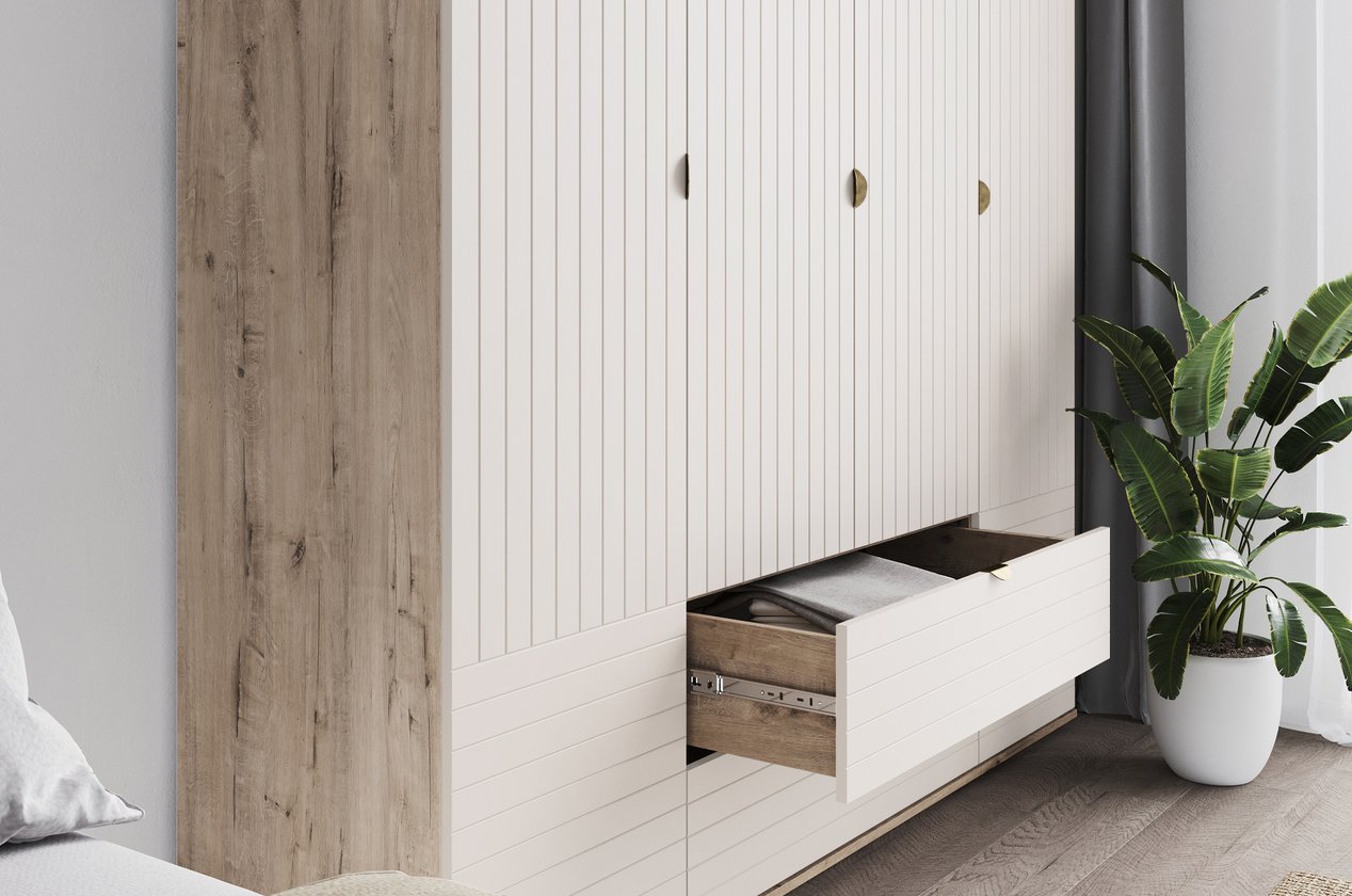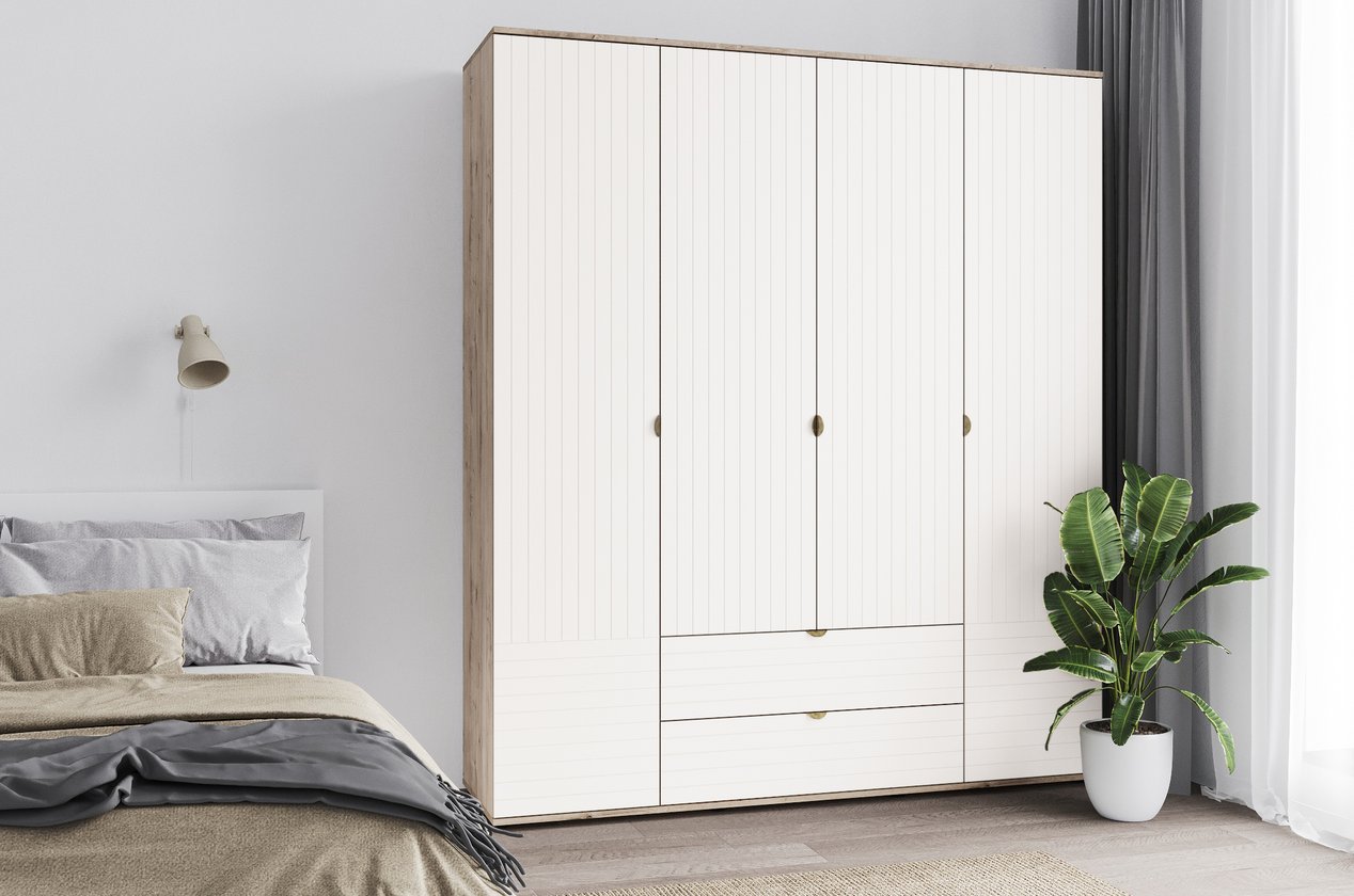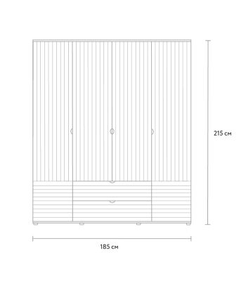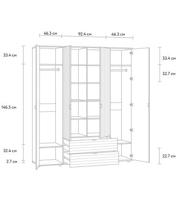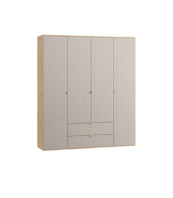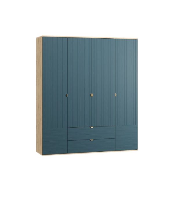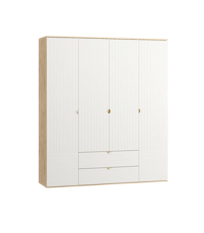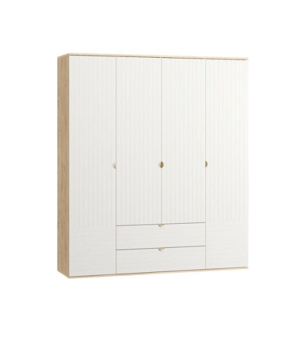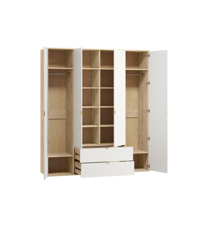 Với kích thước 185x50x215 cm, tủ rộng rãi, tối ưu công năng lưu trữ. Thiết kế gồm 4 cánh: 2 cánh ngoài là khu vực treo quần áo dài. 2 cánh giữa phần trên gồm kệ đựng đồ, thuận tiện xếp quần áo gấp, túi xách, chăn gối. 2 cánh giữa phần dưới gộp thành 2 ngăn kéo, lý tưởng cho đồ dùng cá nhân, phụ kiện nhỏ.