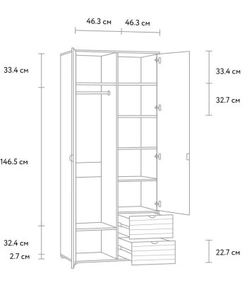 Với kích thước 93x50x215 cm, tủ cao, gọn gàng nhưng tối ưu công năng lưu trữ, phù hợp cho cả phòng ngủ cá nhân và phòng ngủ đôi. Thiết kế gồm 2 cánh tiện lợi: Cánh bên trái bên trong có ngăn kệ trên và dưới, ở giữa là khu vực treo quần áo, giúp lưu trữ quần áo dài, áo khoác và phụ kiện một cách khoa học. Cánh bên phải phần dưới gồm 2 ngăn kéo, bên trong là các ngăn kệ nhỏ, tiện lợi cho việc phân loại đồ dùng nhỏ như tất, phụ kiện, túi xách hoặc đồ cá nhân. Hệ thống bản lề và ray trượt cao cấp đảm bảo mở đóng mượt mà, bền bỉ. Từng chi tiết từ tay nắm đến cạnh tủ được gia công tỉ mỉ, tạo cảm giác chắc chắn và tinh tế.