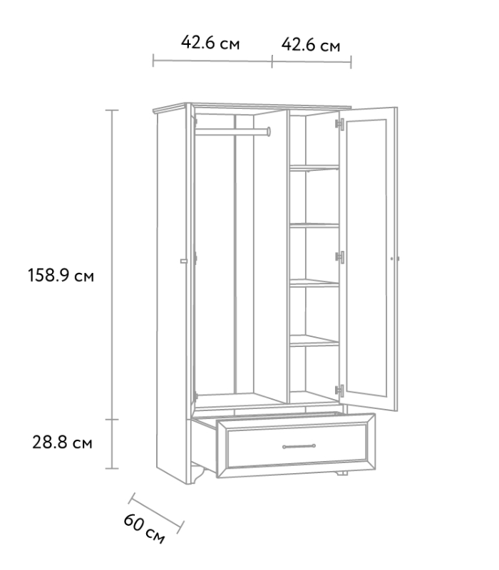 Thiết kế gồm hai khoang chính: một bên treo đồ rộng rãi, một bên chia tầng kèm ngăn kéo phía dưới. Bố cục hợp lý giúp người dùng dễ dàng phân loại quần áo, phụ kiện và giữ cho phòng ngủ luôn gọn gàng.