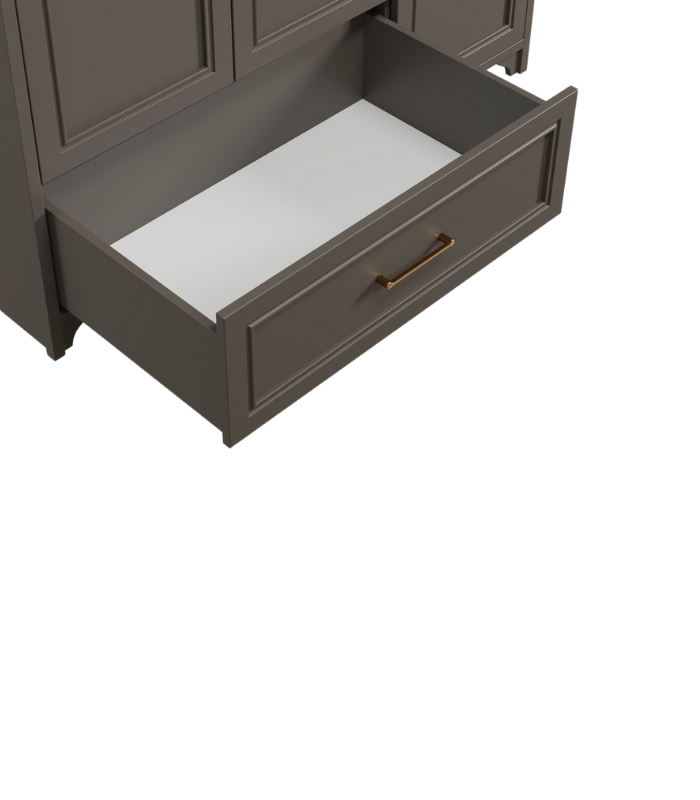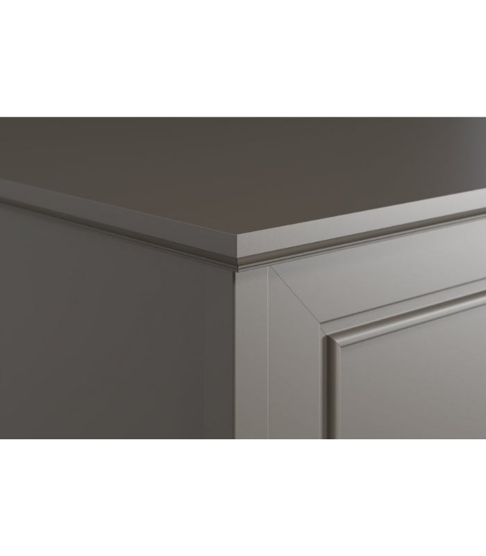 MDF phủ melamine chống ẩm giúp tủ giữ form tốt, chống mốc và bền bỉ theo thời gian. Cánh tủ sơn PU một mặt có họa tiết chỉ phào nổi nhẹ, tạo điểm nhấn tinh tế. Tay nắm kim loại ánh đen tăng thêm phần mạnh mẽ cho tổng thể thiết kế.