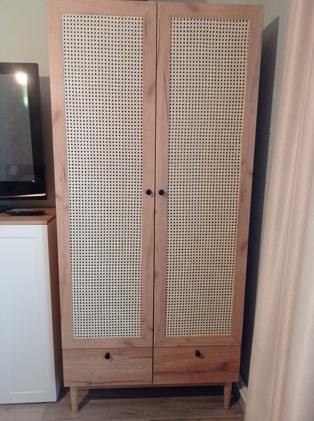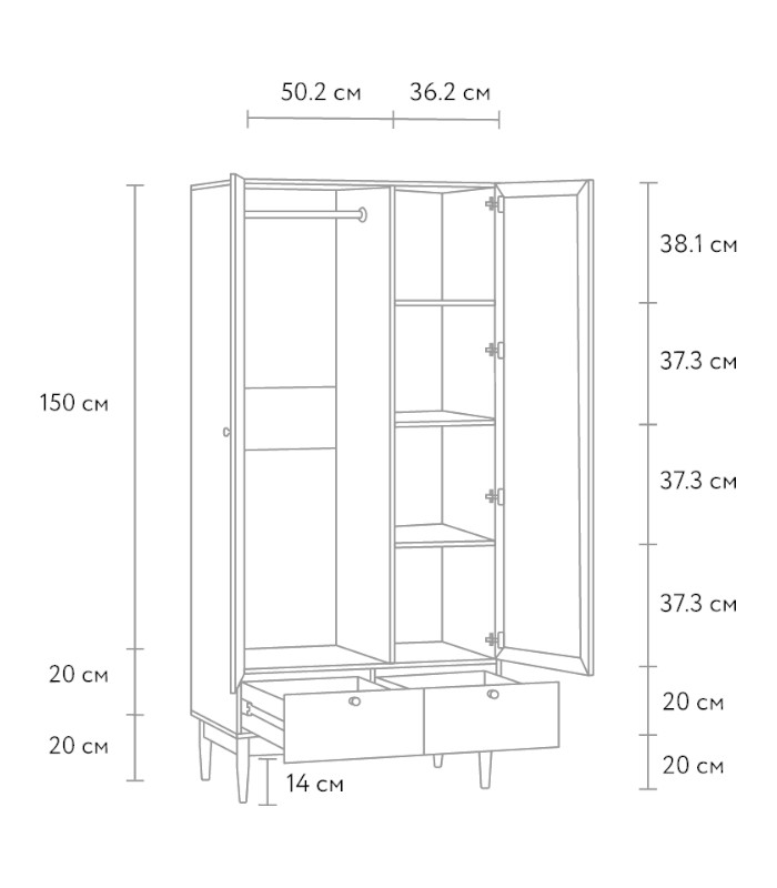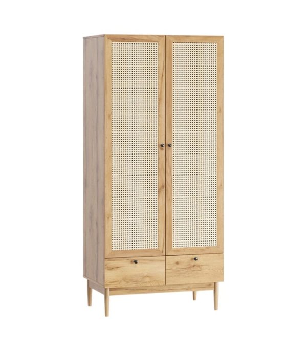 Thiết kế thông minh gồm 2 cánh mở: một bên với 4 ngăn lưu trữ tiện lợi cho quần áo gấp hoặc phụ kiện, một bên dành cho thanh treo đồ, giúp giữ quần áo luôn phẳng phiu và ngăn nắp. Phía dưới là 2 hộc tủ kéo, tối ưu hóa không gian lưu trữ cho các vật dụng nhỏ, từ đồ dùng cá nhân đến phụ kiện thời trang.