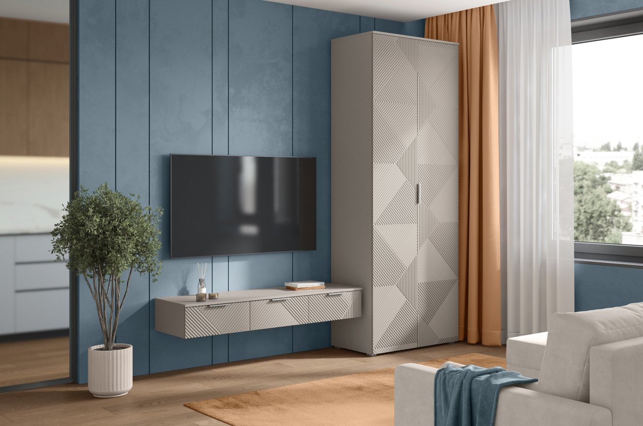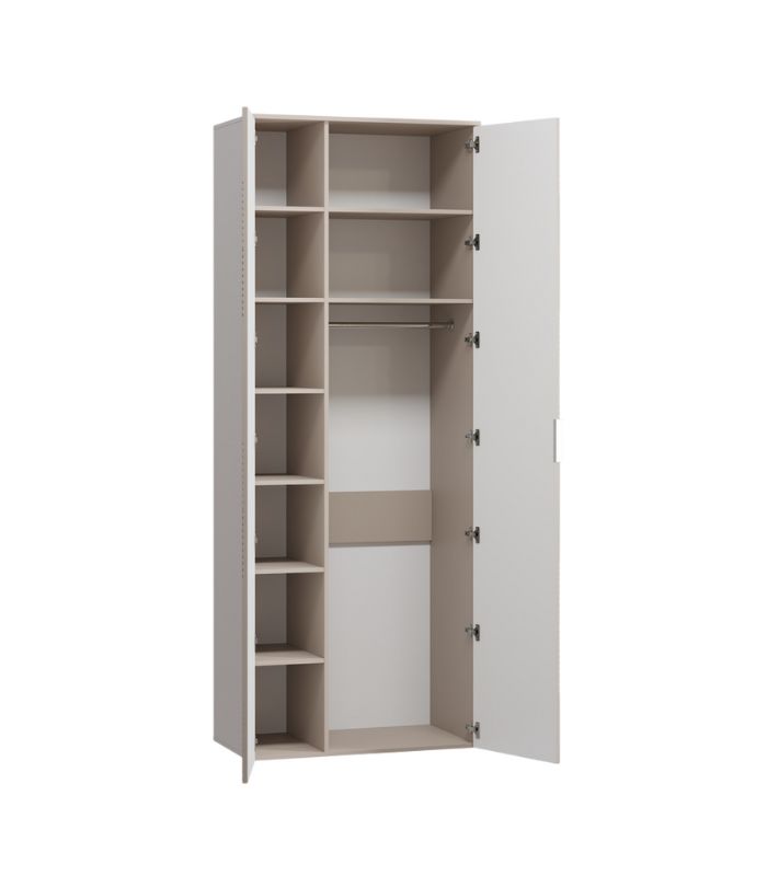 Thiết kế cao 240cm giúp tận dụng tối đa chiều cao căn phòng. Bố trí bên trong khoa học: Cánh trái gồm nhiều ngăn kệ nhỏ gọn để xếp áo quần gấp hoặc phụ kiện. Cánh phải là khu vực treo quần áo tiện lợi cho đồ dài.