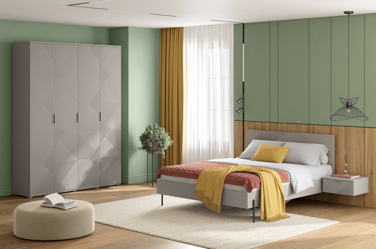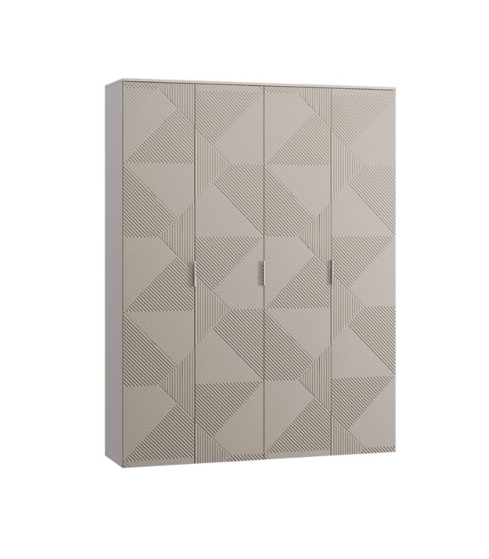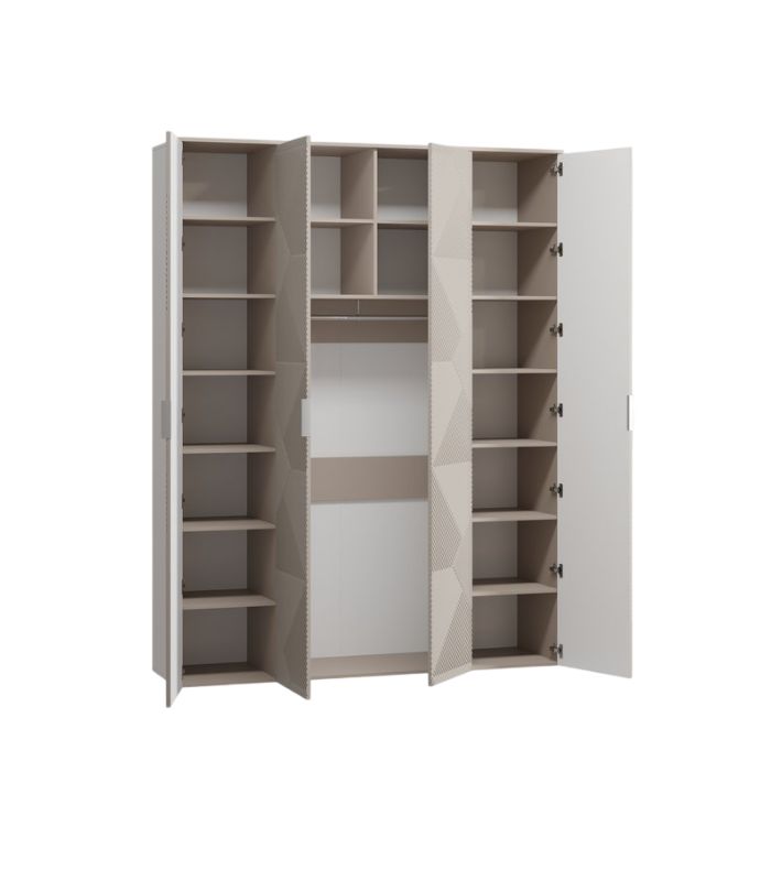 Thiết kế gồm 4 cánh rộng: Hai cánh ngoài được chia thành các kệ nhiều tầng, rất tiện để cất quần áo gấp, khăn, túi xách hoặc phụ kiện. Hai cánh giữa tạo thành khu vực treo quần áo lớn, phù hợp cho các loại trang phục dài và cần giữ form. Phía trên được bố trí thêm các ngăn kệ để chứa đồ theo mùa, vali nhỏ hay chăn dự phòng.