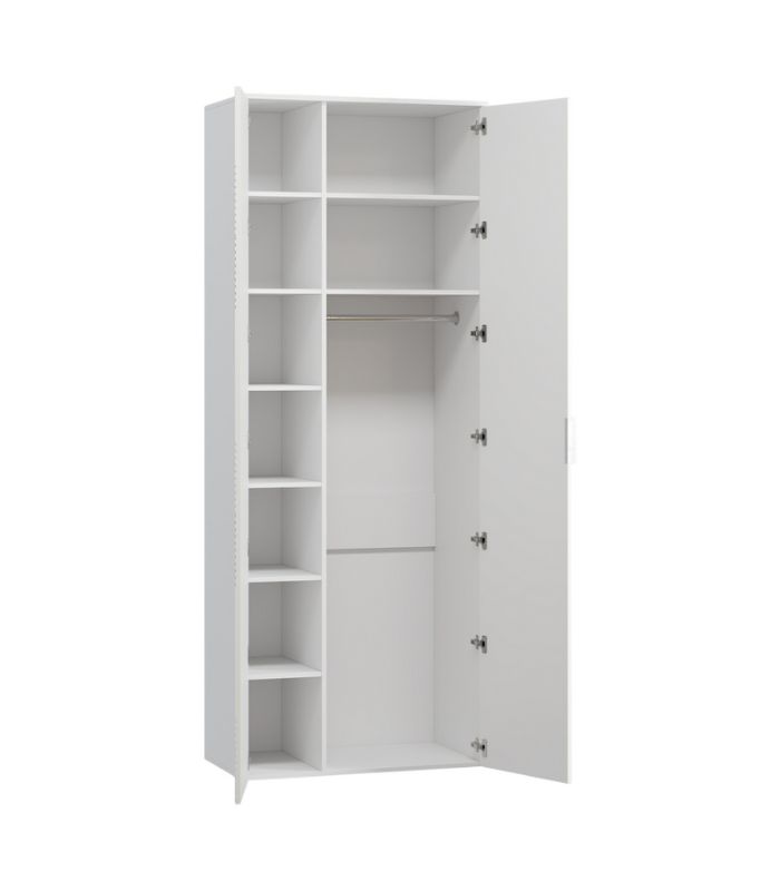 Với kích thước 91x50x240cm, tủ có chiều cao lý tưởng, tăng khả năng chứa đồ tối đa. Bố cục bên trong được chia hợp lý: Cánh trái gồm nhiều ngăn kệ nhỏ để đựng đồ gấp, khăn, túi xách hoặc phụ kiện. Cánh phải là khu vực treo quần áo rộng rãi, giữ form áo dài, váy, vest…