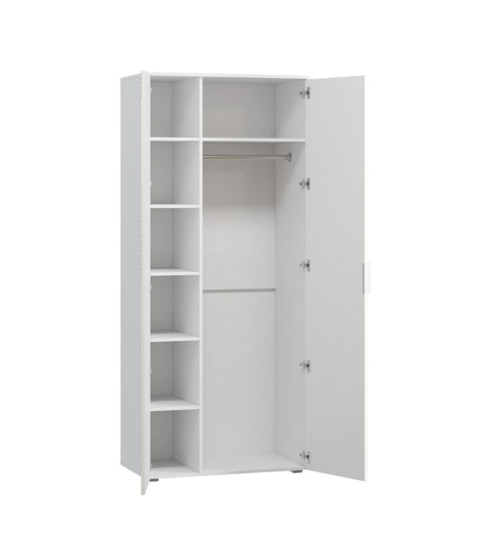 Với kích thước 91x50x212cm, chiếc tủ tuy gọn nhưng tối ưu được sức chứa nhờ bố cục thông minh: Cánh trái gồm nhiều ngăn kệ nhỏ để xếp quần áo gấp, túi xách hoặc phụ kiện. Cánh phải là khu vực treo quần áo rộng rãi, phù hợp cho áo sơ mi, váy, áo khoác và đồ dài.