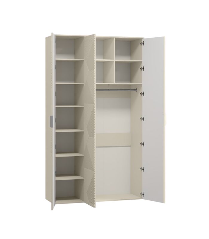 Cánh trái bố trí các ngăn kệ nhiều tầng, tiện cho việc sắp xếp quần áo gấp, khăn, túi xách hoặc vật dụng cá nhân. Hai cánh còn lại dành cho khu vực treo đồ diện tích lớn, giúp bảo quản áo dài, váy, sơ mi, vest luôn thẳng phẳng. Phía trên có các ngăn kệ hộp dành cho chăn mỏng, vali hoặc các vật dụng theo mùa.