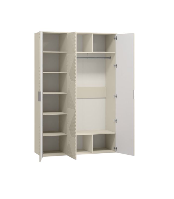 Kết cấu tủ gồm 3 cánh mở: Cánh trái là khu vực ngăn kệ được chia nhỏ để sắp xếp đồ gấp ngăn nắp. Cánh giữa & cánh phải là khu vực treo quần áo kết hợp kệ đựng đồ tiện lợi.