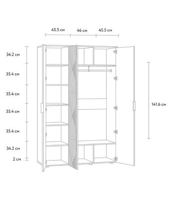 Thiết kế 3 cánh rộng, bố trí chức năng rõ ràng: Cánh trái gồm nhiều ngăn kệ nhỏ để đồ gấp, hộp phụ kiện hoặc khăn. Cánh giữa & cánh phải tạo thành khu vực treo quần áo có sức chứa lớn, kèm các kệ phụ để tối ưu diện tích.