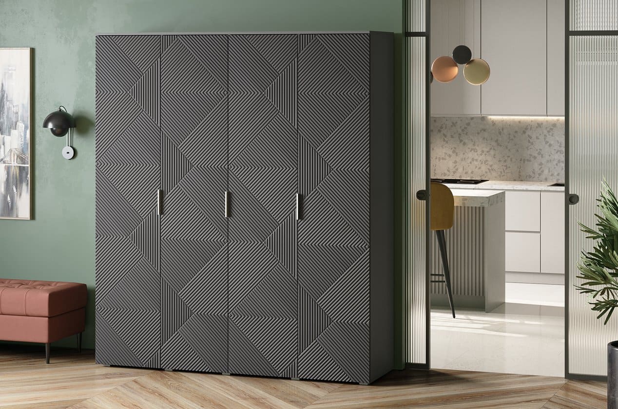 Tủ Quần Áo Shelton Xám Chì – 4 là lựa chọn dành cho những không gian yêu thích sự hiện đại, cá tính và sang trọng. Tủ được làm từ MDF phủ Melamine chống ẩm kết hợp cánh sơn PU cao cấp, mang đến độ bền vượt trội và chống trầy hiệu quả.