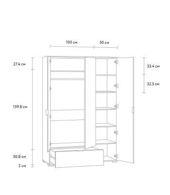 Bên trong tủ, khu vực treo đồ rộng rãi đáp ứng nhu cầu treo váy dài, áo dài hoặc vest. Hệ kệ nhiều tầng bên cạnh thuận tiện xếp gọn quần áo, túi xách và phụ kiện. Ngăn kéo trượt êm phía dưới hỗ trợ lưu trữ đồ nhỏ kính đáo như khăn hoặc các vật dụng cá nhân cần cất kín.