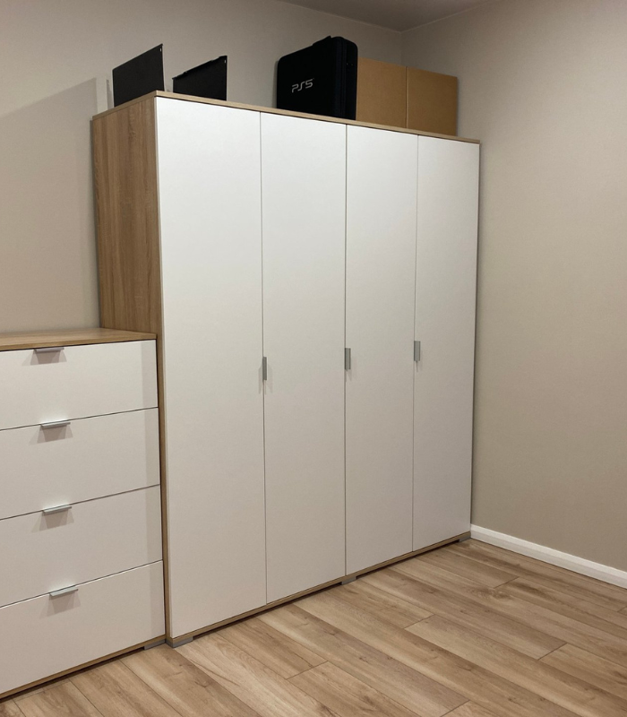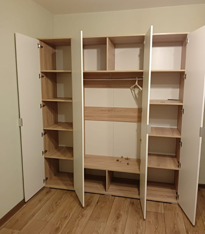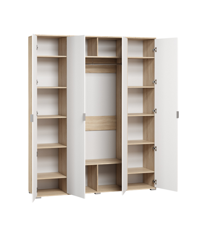 Thiết kế chia khoang hợp lý với hai thanh treo chạy dọc tạo không gian thoải mái cho quần áo dài, áo khoác hoặc những bộ đồ cần giữ form. Các ngăn nhỏ phía dưới hỗ trợ cất xếp phụ kiện, đồ theo mùa hoặc set quần áo gấp. Hệ ngăn trên cao giúp bạn tận dụng tối đa không gian lưu trữ, hạn chế sự bừa bộn cho phòng ngủ. Màu gỗ sồi sáng làm căn phòng trở nên ấm áp nhưng vẫn trẻ trung và hiện đại.
