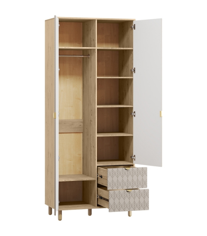 Bên trong tủ được chia thành hai khoang chính: khoang bên trái là ngăn treo đồ rộng rãi có thêm kệ phụ bên dưới, trong khi bên phải gồm các tầng kệ chia ô cùng hai hộc kéo tiện lợi giúp cất giữ đồ gấp, chăn mỏng hay phụ kiện gọn gàng. Các chân gỗ tròn chắc chắn nâng đỡ toàn bộ kết cấu, giúp tủ luôn ổn định và dễ vệ sinh sàn bên dưới.