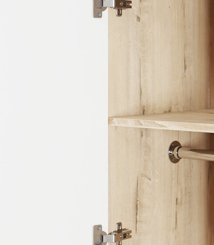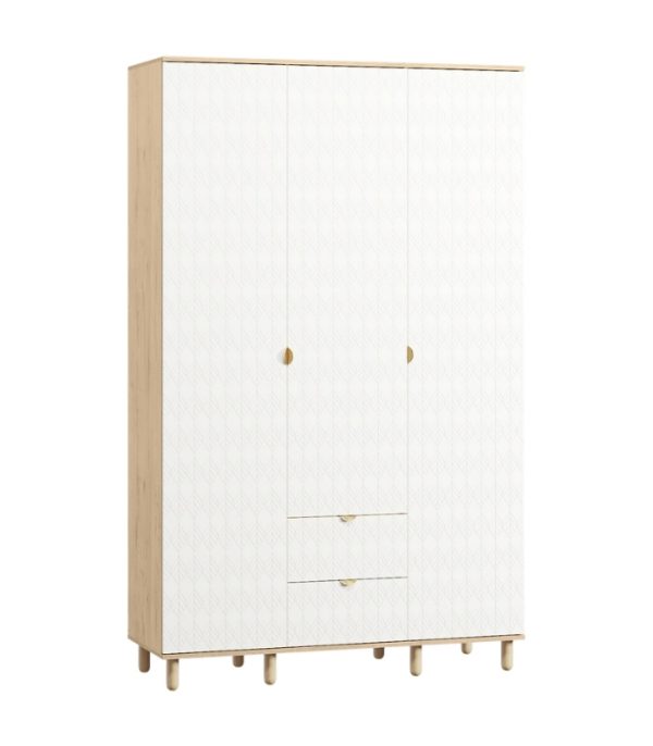 Tủ được chia bố cục hợp lý gồm 3 cánh mở và 2 hộc kéo ở giữa. Bên trái là ngăn treo quần áo rộng rãi; bên phải chia tầng tiện lợi để xếp gấp đồ; giữa tủ là hai hộc kéo thuận tiện cho việc cất giữ phụ kiện, đồ nhỏ gọn. Thiết kế này giúp tận dụng tối đa không gian mà vẫn đảm bảo tính thẩm mỹ gọn gàng.