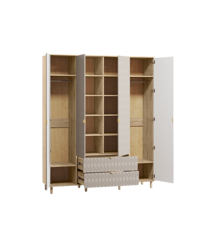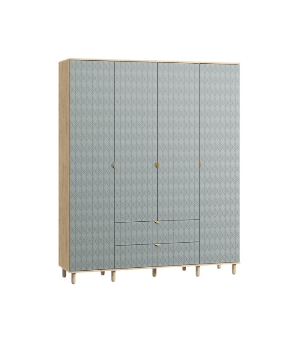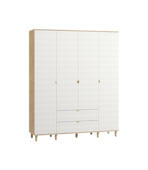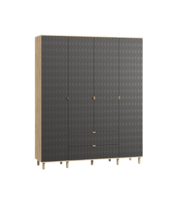 Tủ được chia làm 4 cánh lớn, trong đó 2 cánh giữa ngắn hơn, để chừa vị trí cho hai tầng hộc kéo rộng bên dưới – tạo điểm nhấn tiện dụng và hài hòa về thị giác. Hai bên tủ có ngăn treo và ngăn xếp đồ riêng biệt, giúp sắp xếp quần áo khoa học. Chân gỗ tròn chắc chắn giúp nâng tủ cao, tạo độ thoáng và dễ vệ sinh sàn bên dưới.