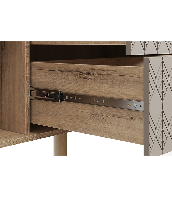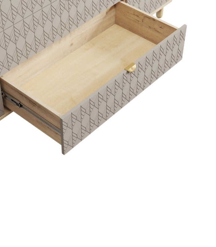Sản phẩm được gia công từ ván MDF chống ẩm phủ melamine, kết hợp cánh sơn phủ PU một mặt với hiệu ứng lá tinh tế đặc trưng của bộ sưu tập Tedjons. Chất liệu MDF dày 17mm giúp kết cấu vững vàng, hạn chế cong vênh trong điều kiện khí hậu nhiệt đới.