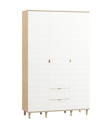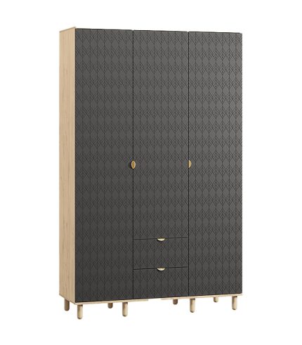 Thiết kế gồm 3 cánh mở và 2 hộc kéo trung tâm, trong đó ngăn trái dành cho quần áo treo, ngăn phải chia thành nhiều tầng kệ, và giữa tủ là các hộc kéo tiện lợi. Tủ có 8 chân gỗ tròn nâng đỡ, giúp tổng thể thanh thoát và dễ dàng vệ sinh bên dưới.
