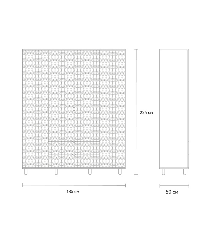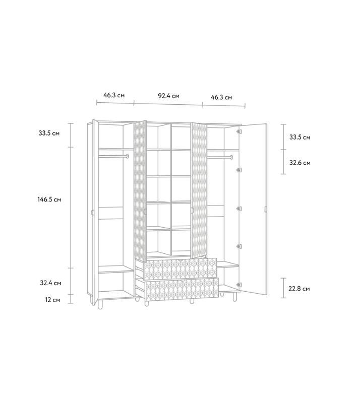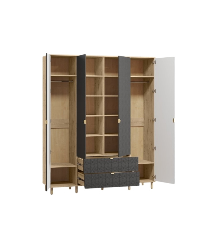 Tủ có 4 cánh mở, bố trí hai tầng hộc kéo bên dưới giúp tận dụng tối đa không gian lưu trữ. Hai cánh bên ngoài chia thành ngăn treo và ngăn xếp, phục vụ nhiều nhu cầu sắp xếp khác nhau. Cấu trúc tủ được nâng đỡ bằng các chân gỗ tròn, vừa chắc chắn vừa tạo độ thoáng nhẹ cho phần chân tủ.
