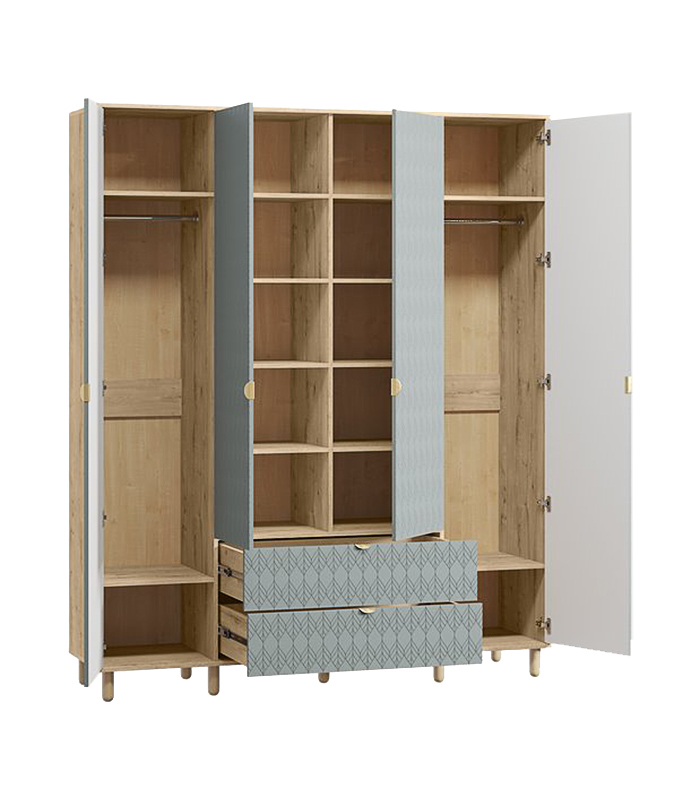 Kết cấu tủ gồm 4 cánh mở, trong đó 2 cánh giữa được rút ngắn để dành không gian cho hai hộc kéo tiện dụng bên dưới. Hai cánh ngoài là khu vực kết hợp ngăn treo và ngăn xếp, giúp sắp đặt trang phục linh hoạt.
