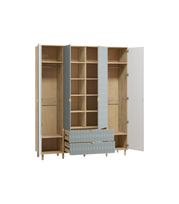 Kết cấu tủ gồm 4 cánh mở, trong đó 2 cánh giữa được rút ngắn để dành không gian cho hai hộc kéo tiện dụng bên dưới. Hai cánh ngoài là khu vực kết hợp ngăn treo và ngăn xếp, giúp sắp đặt trang phục linh hoạt.