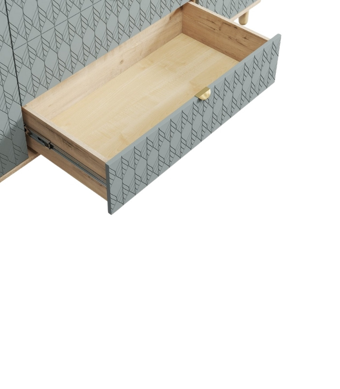 Tay nắm vàng ánh kim là điểm nhấn tinh xảo, tôn lên sắc xanh trang nhã. Bản lề cao cấp giúp việc đóng mở cánh nhẹ nhàng và êm ái. Với kích thước rộng, tủ đáp ứng đủ nhu cầu lưu trữ cho gia đình, đồng thời tạo điểm nhấn thẩm mỹ cho không gian.
