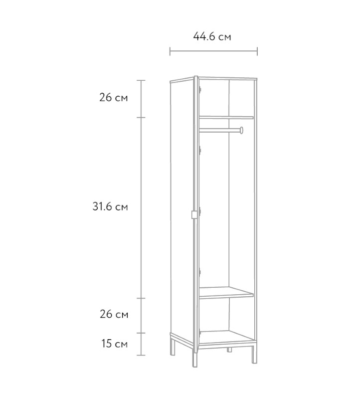 Với kích thước 48x55x205 cm, tủ được thiết kế tối ưu với 1 cánh mở, bên trong bao gồm 1 ngăn treo đồ rộng rãi cùng 2 ngăn nhỏ tiện dụng, giúp phân loại quần áo, phụ kiện hay các vật dụng cá nhân một cách khoa học. Thiết kế này vừa đảm bảo sự gọn gàng, vừa nâng tầm trải nghiệm sử dụng, mang lại không gian sống ngăn nắp và tiện lợi.