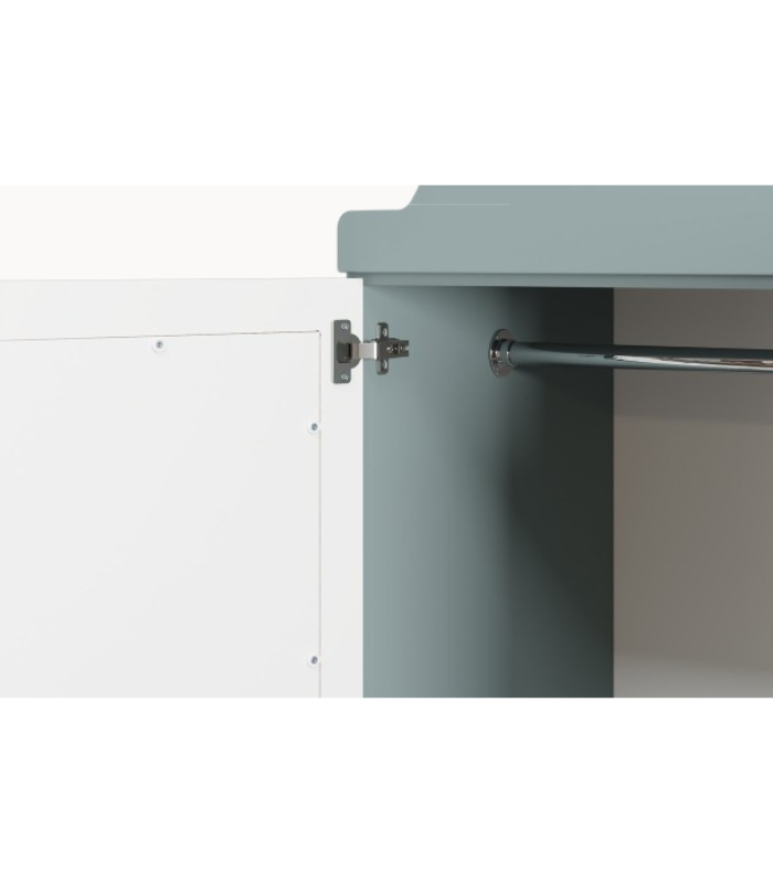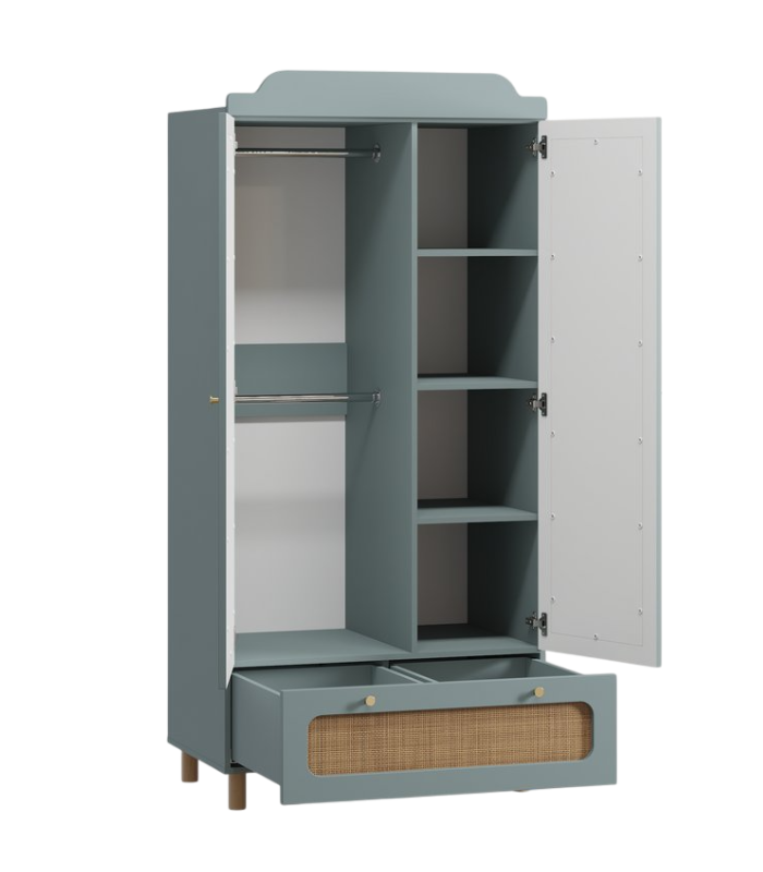 Tủ gồm 2 cánh: một bên dành cho việc treo quần áo, giúp trang phục luôn phẳng phiu, bên còn lại chia thành nhiều hộc tiện lợi để gấp đồ hoặc sắp xếp các vật dụng nhỏ, tạo thói quen ngăn nắp cho bé. Phía dưới là một hộc kéo rộng, lý tưởng để cất giữ đồ lặt vặt hoặc đồ chơi, giữ cho phòng luôn gọn gàng.