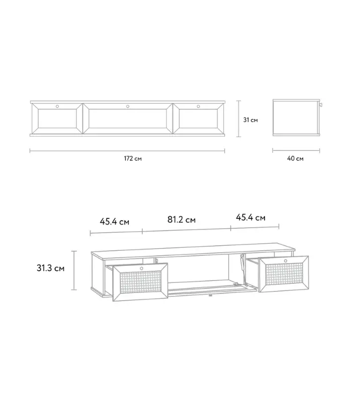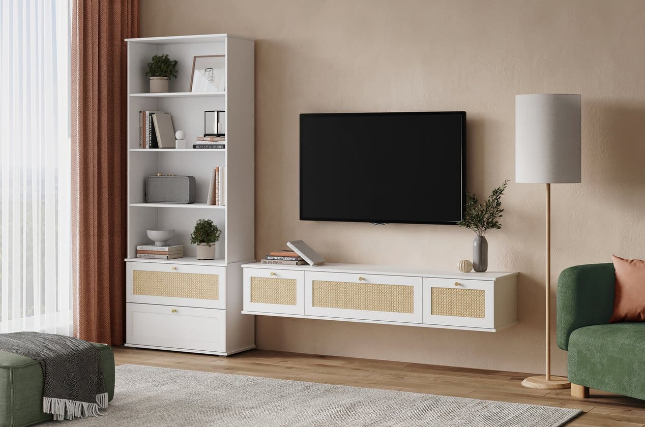 Cánh tủ gồm ba khoang đóng mở linh hoạt – hai bên là ngăn chứa đồ riêng biệt, ở giữa là ngăn lớn có thể mở hạ xuống tiện dụng, giúp người dùng sắp xếp gọn gàng thiết bị điện tử, sách báo hay các vật dụng trang trí. Sự kết hợp giữa tông trắng thanh lịch và họa tiết mây mang lại nét gần gũi tự nhiên, phù hợp với nhiều phong cách không gian khác nhau.