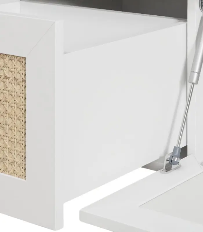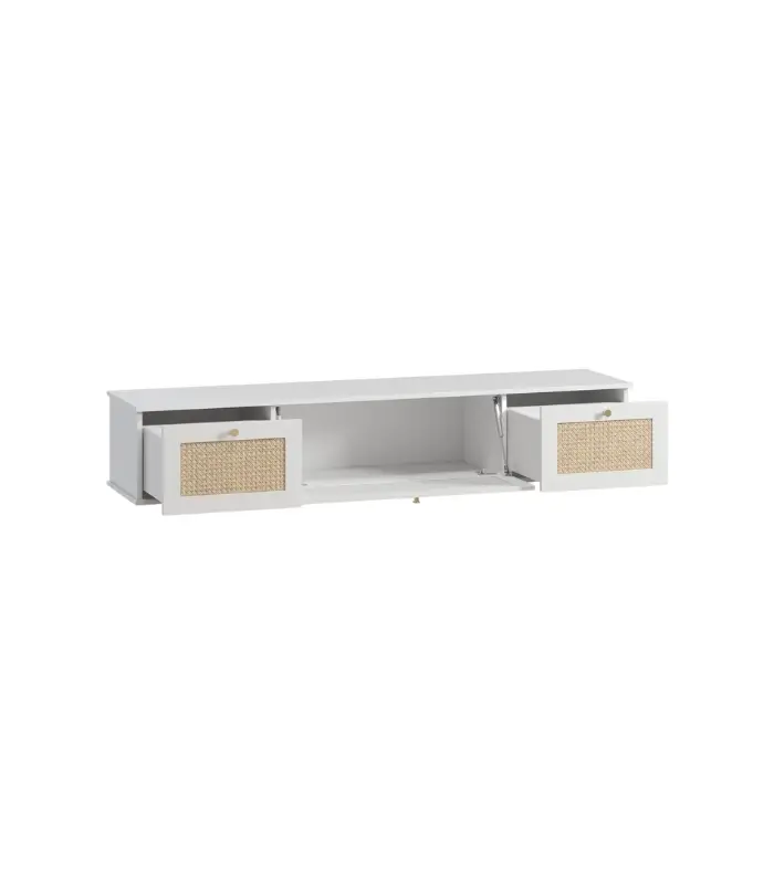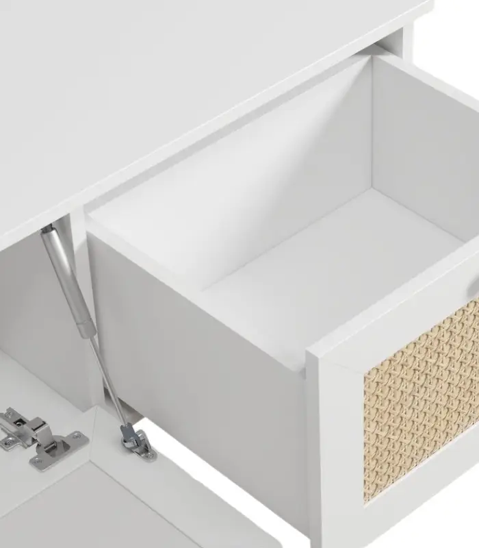 Cánh tủ gồm ba khoang đóng mở linh hoạt – hai bên là ngăn chứa đồ riêng biệt, ở giữa là ngăn lớn có thể mở hạ xuống tiện dụng, giúp người dùng sắp xếp gọn gàng thiết bị điện tử, sách báo hay các vật dụng trang trí. Sự kết hợp giữa tông trắng thanh lịch và họa tiết mây mang lại nét gần gũi tự nhiên, phù hợp với nhiều phong cách không gian khác nhau.